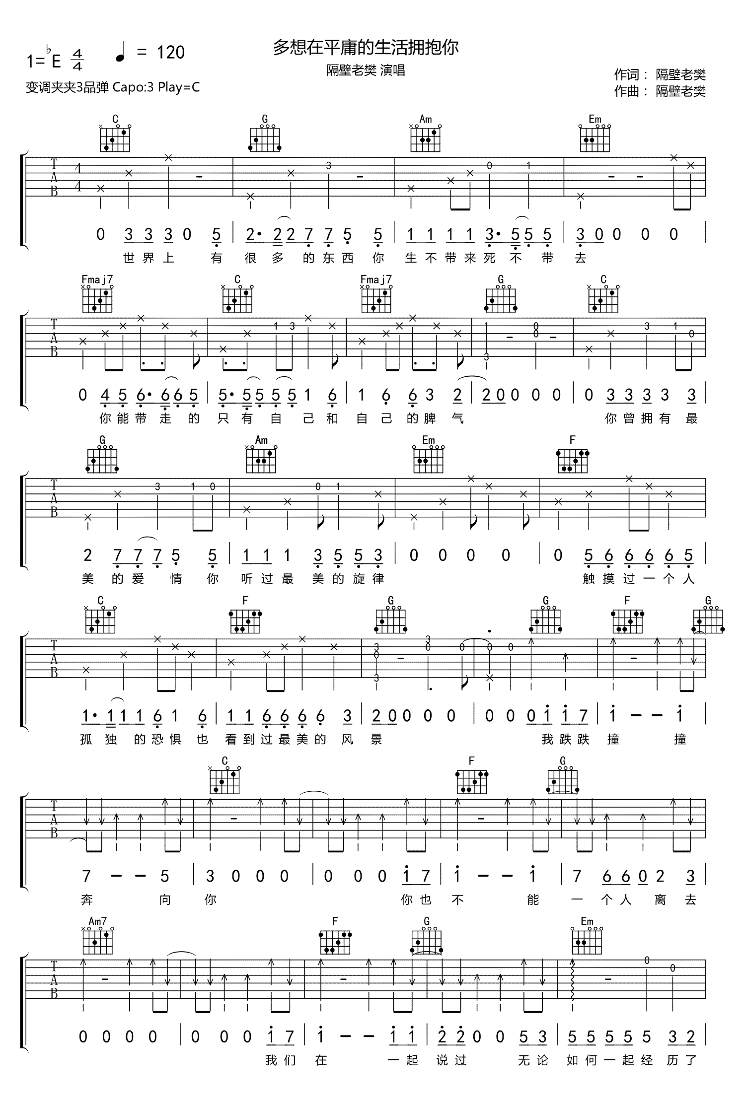 吉他 隔壁老樊《多想在平庸的生活拥抱你》吉他谱_吉他弹唱谱_网络转载编配