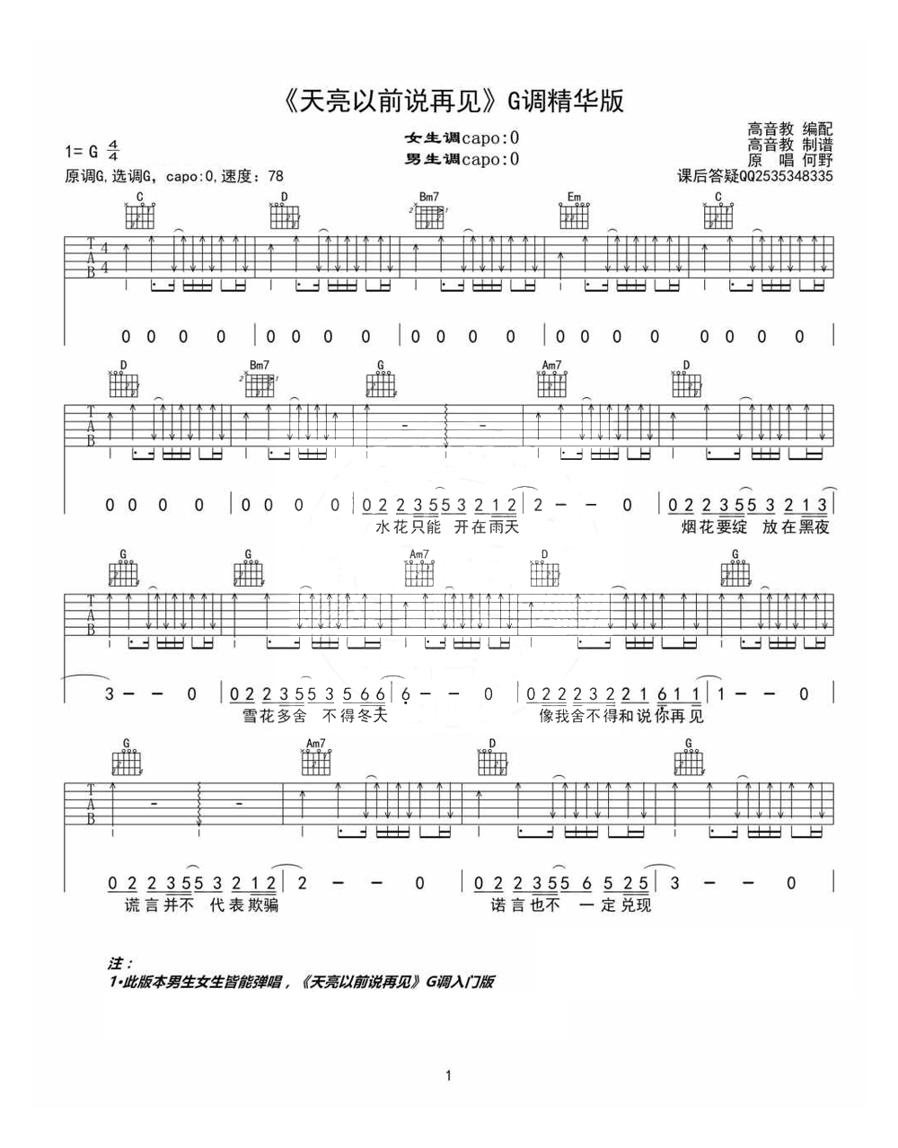 吉他何野《天亮以前说再见》吉他谱_吉他弹唱谱_高音教编配