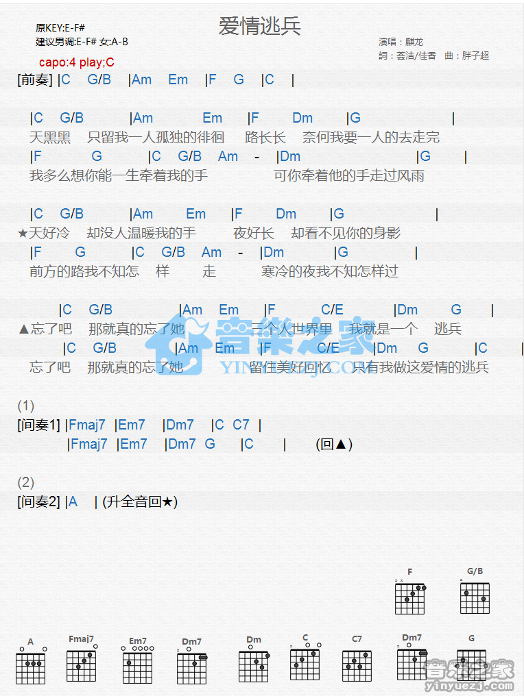 吉他麒龙《爱情逃兵》吉他谱_吉他弹唱谱_YYZJ编配