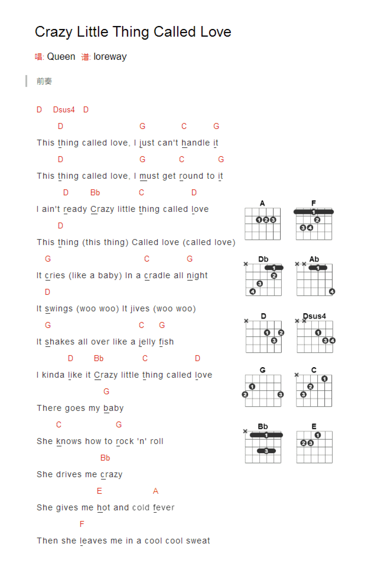 Queen《CrazyLittleThingCalledLove》吉他和弦弹唱谱...