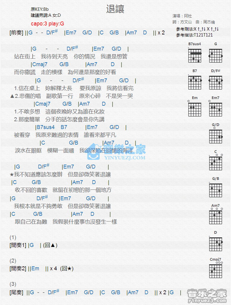吉他阿杜《退让》吉他谱_吉他弹唱谱_YYZJ编配