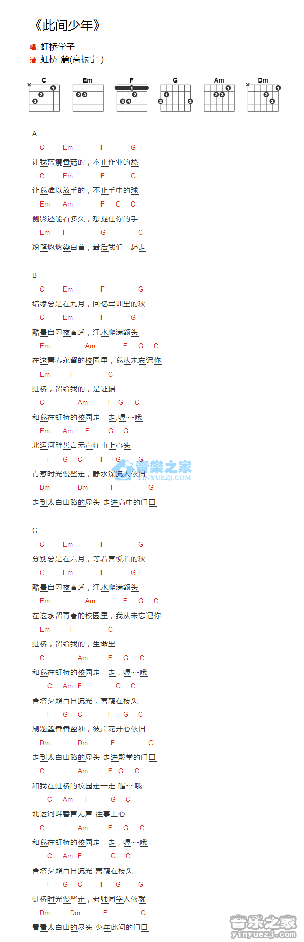 虹桥学子《此间少年》吉他和弦弹唱谱...