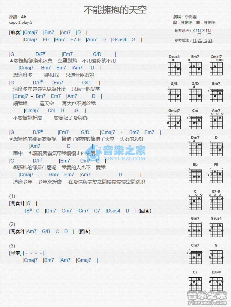 G调版李岗霖《不能拥抱的天空》吉他和弦弹唱谱...