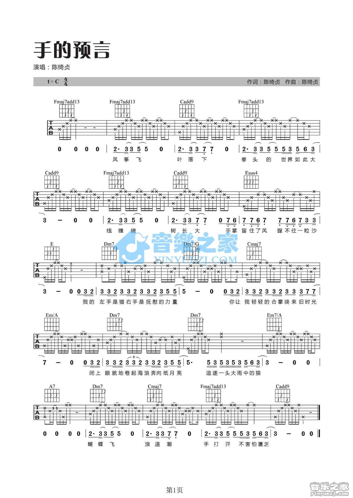 吉他陈绮贞《手的预言》吉他谱_吉他弹唱谱_YYZJ编配