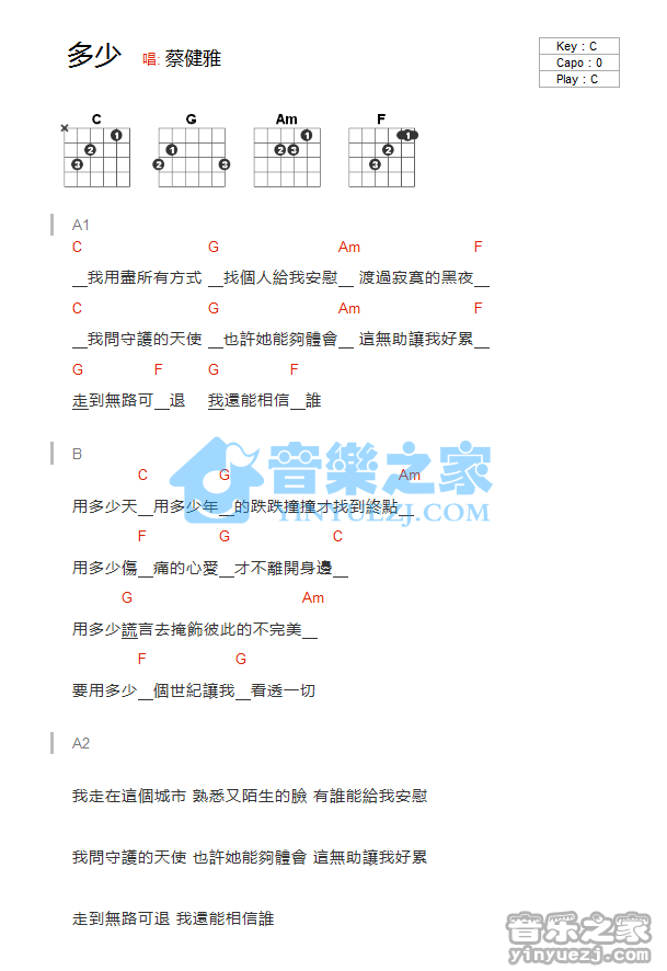 C调版蔡健雅《多少》吉他和弦弹唱谱...