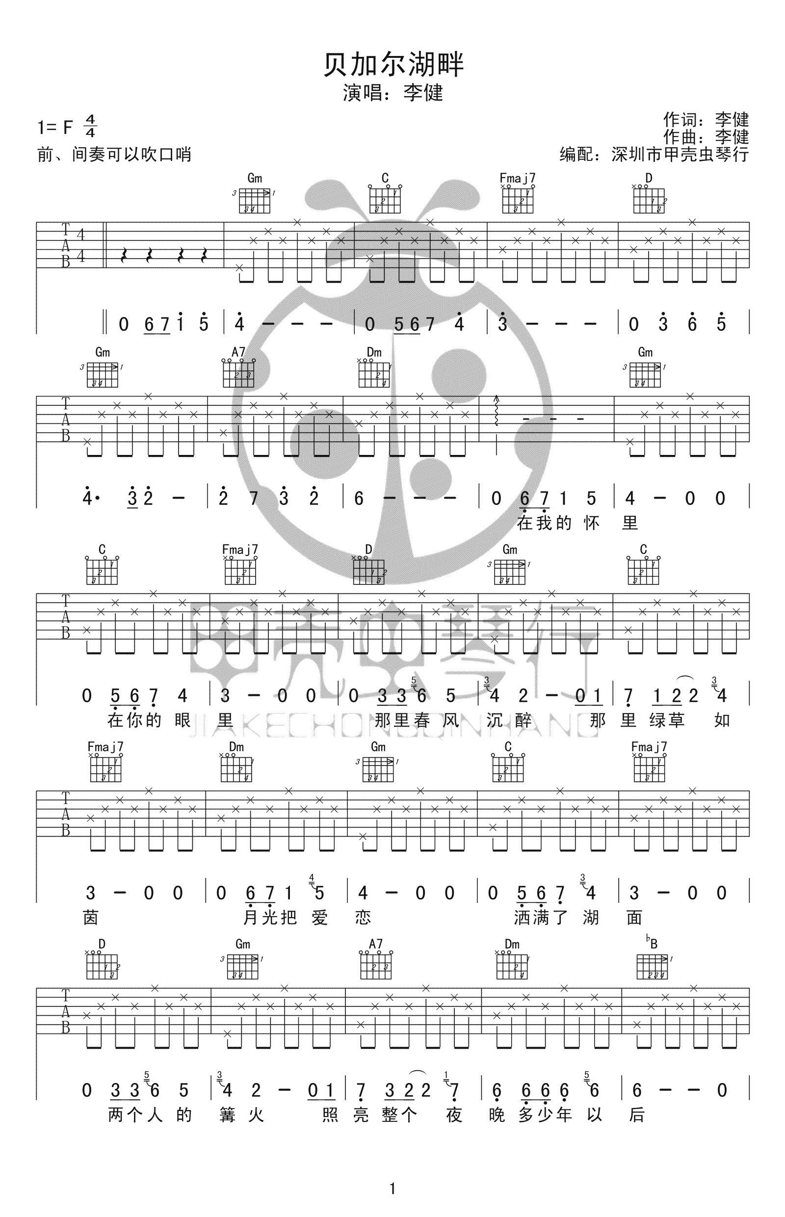 吉他李健《贝加尔湖畔》吉他谱_吉他弹唱谱_甲壳虫琴行编配