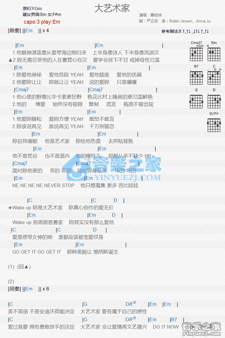 吉他蔡依林《大艺术家》吉他谱_吉他弹唱谱_YYZJ编配