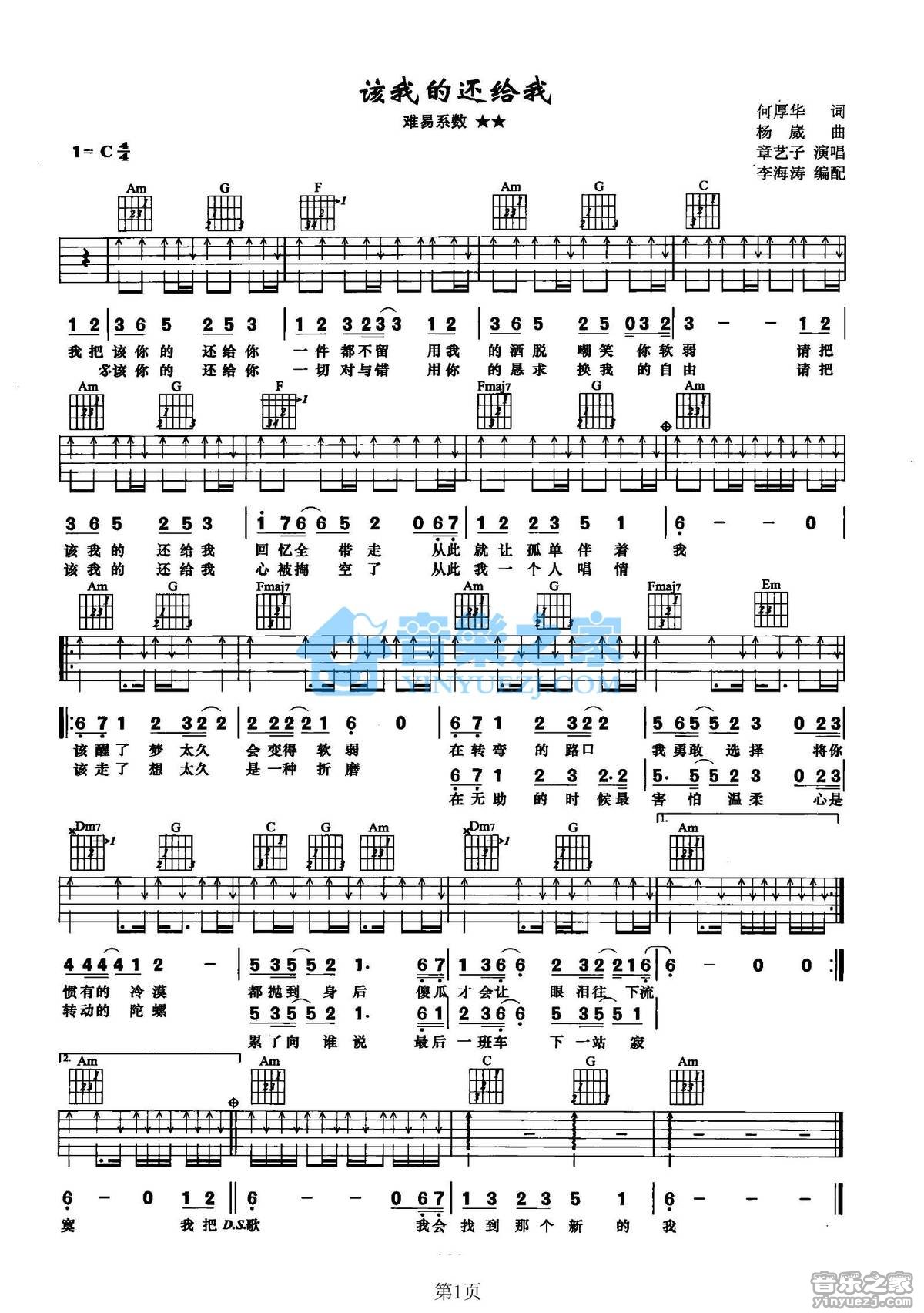 吉他章艺子《该我的还给我》吉他谱_吉他弹唱谱