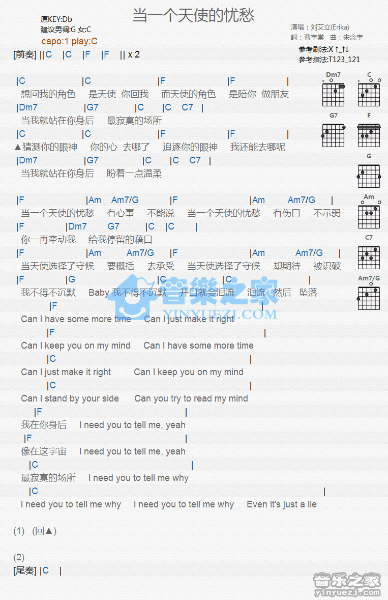 C调版刘艾立《当一个天使的忧愁》吉他和弦弹唱谱...