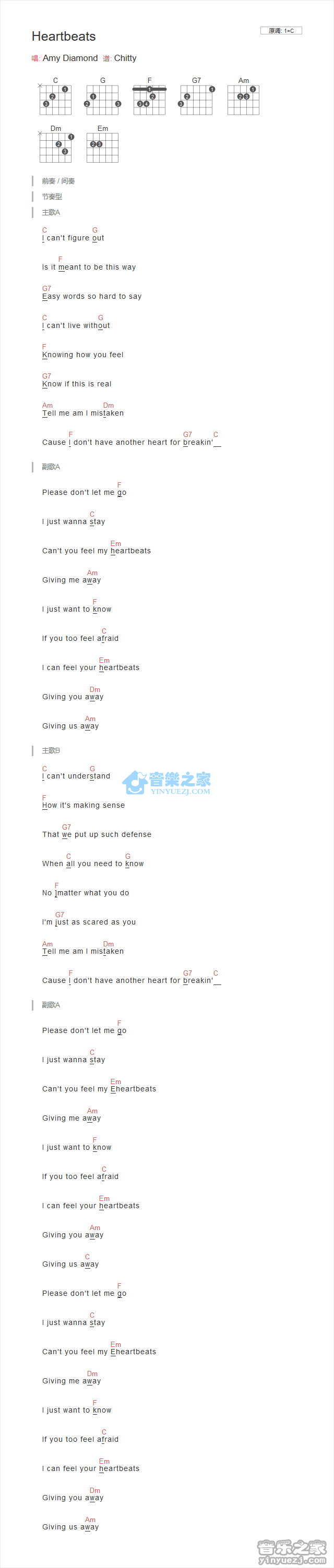 C调版AmyDiamond《Heartbeats》吉他和弦弹唱谱...