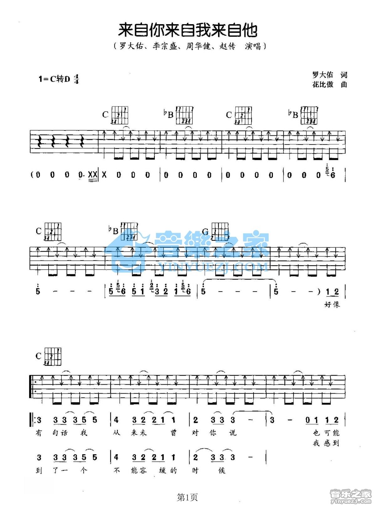 C调版罗大佑《来自你来自我来自他》吉他弹唱六线谱...