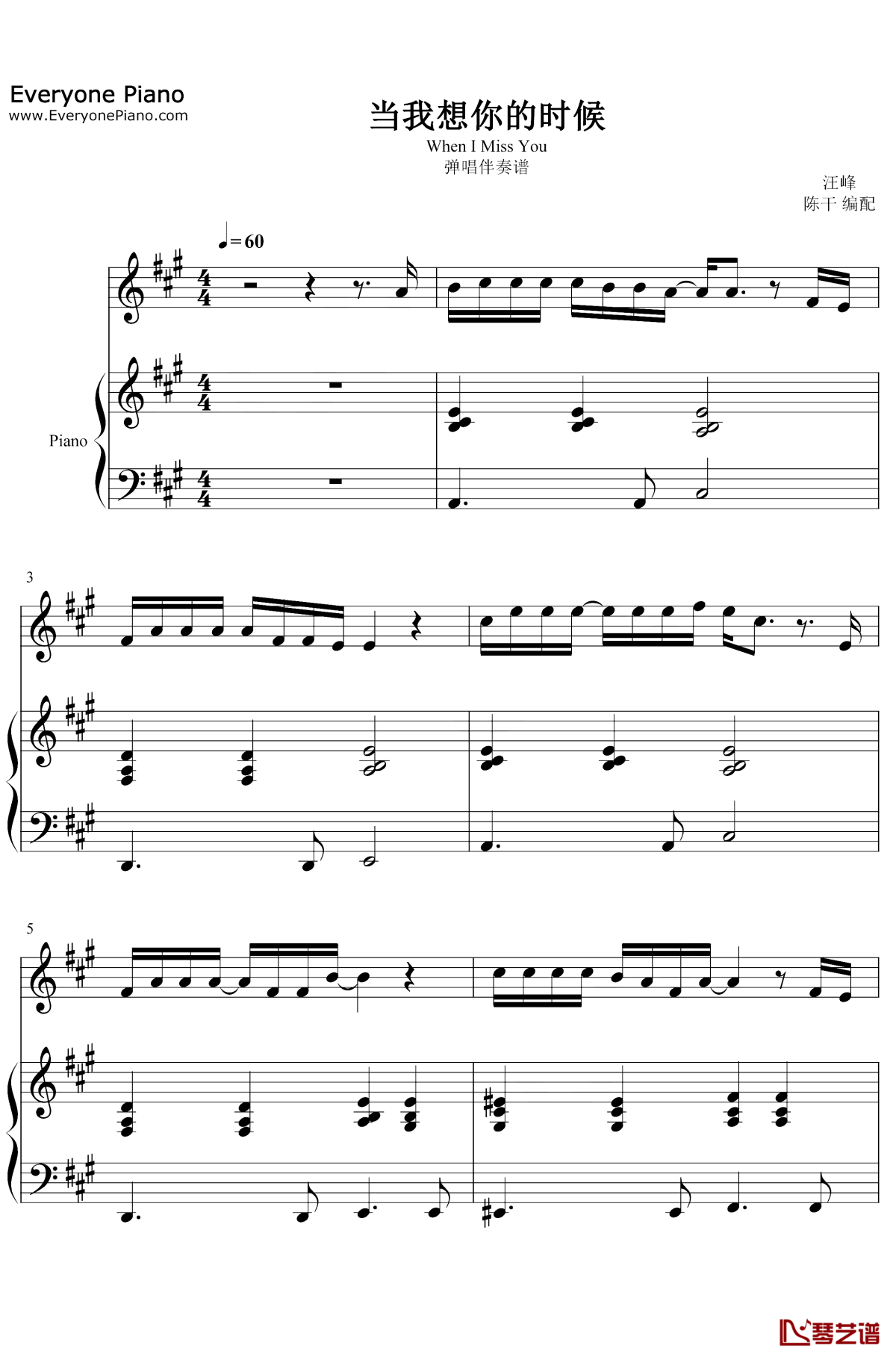钢琴汪峰《当我想你的时候》钢琴谱-弹唱伴奏谱