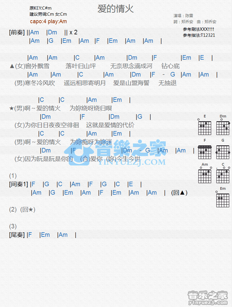 Am调版陈雷《爱的情火》吉他和弦弹唱谱...