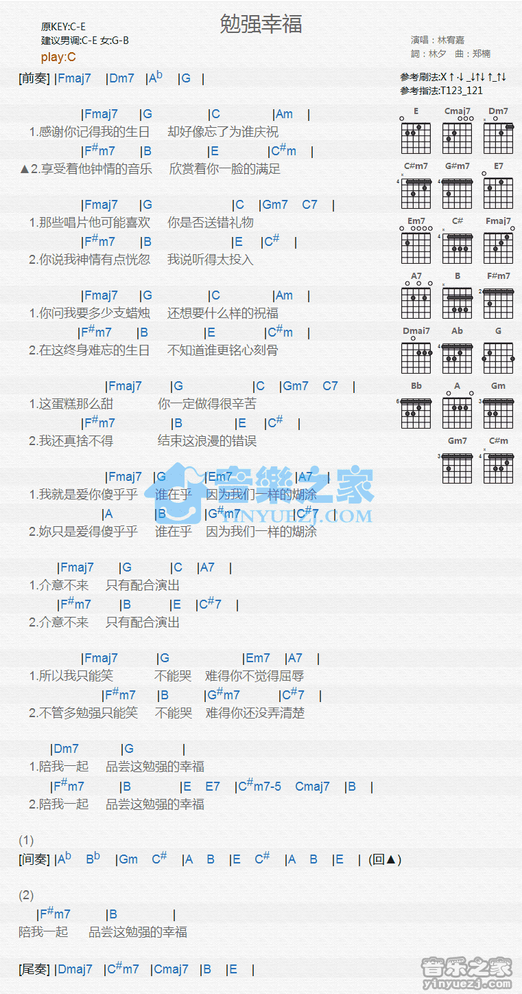C调版林宥嘉《勉强幸福》吉他和弦弹唱谱...
