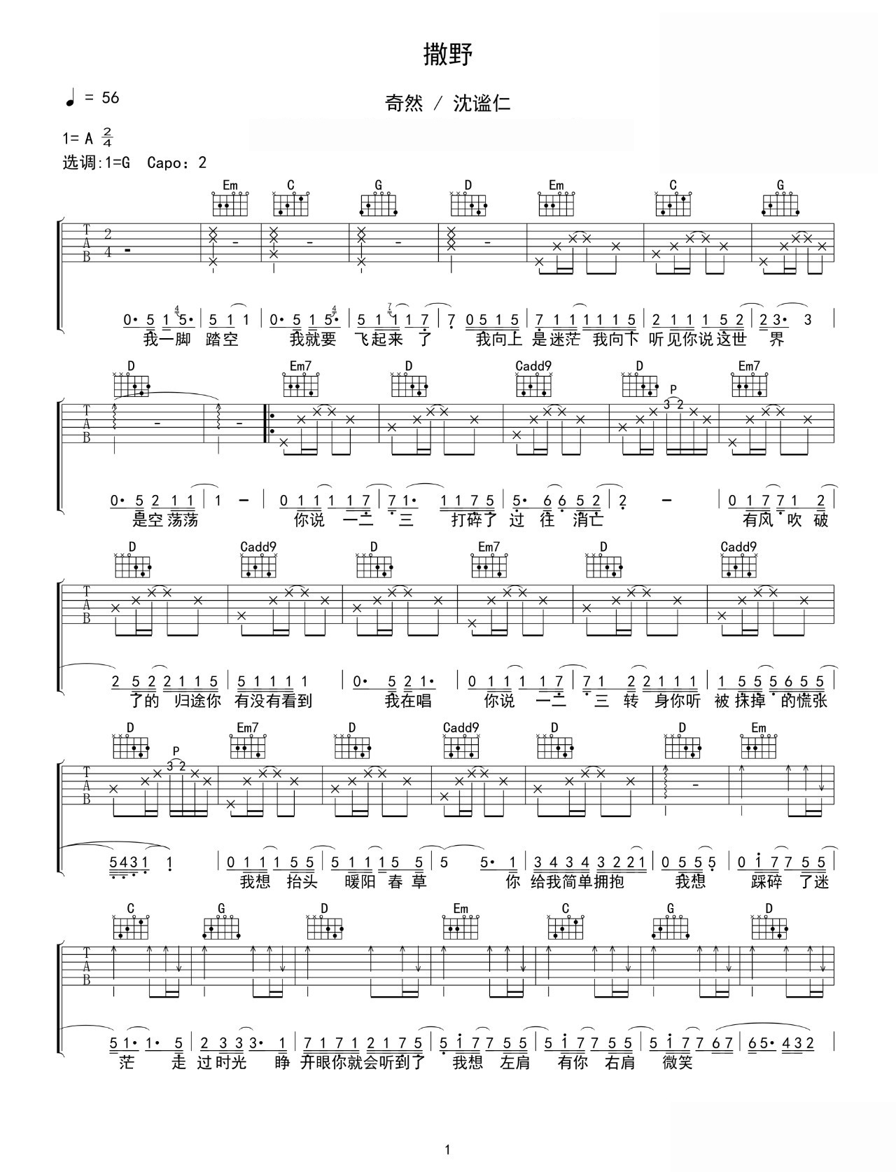 吉他奇然/沈谧仁《撒野》吉他谱_吉他弹唱谱_吴先生编配