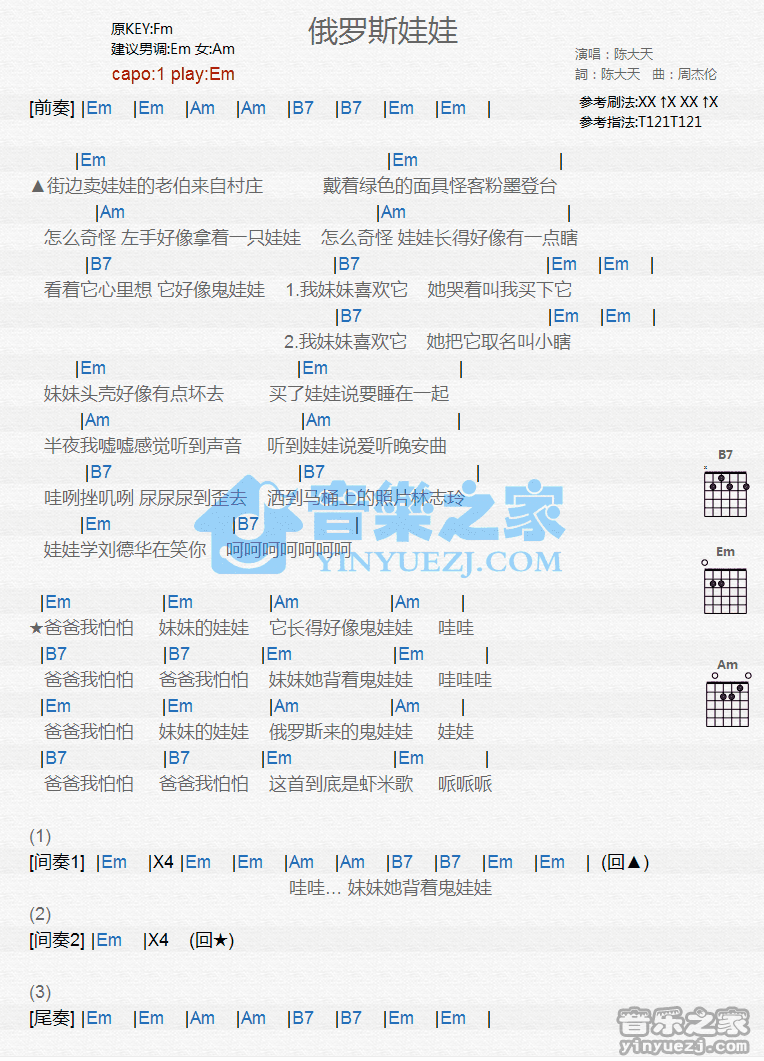 Em调版陈大天《俄罗斯娃娃》吉他和弦弹唱谱...