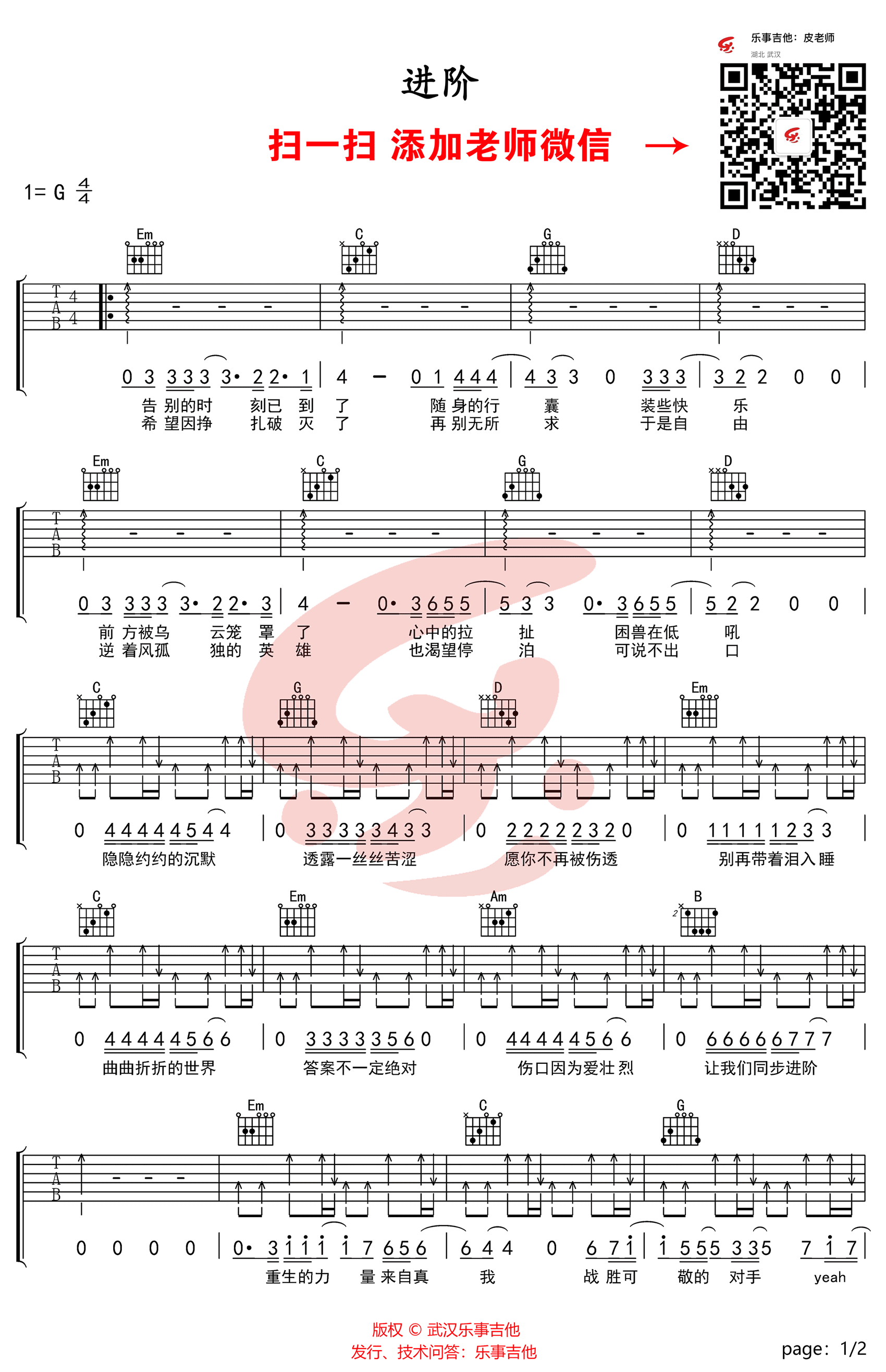 进阶吉他谱,林俊杰新歌,圣所2.0演唱会主题曲,进阶》吉他六线谱,G调指法弹唱,这首《进阶》很励志也很青春,动感十足,是JJ自己的写照。新的一年,愿意放下所有遗憾、不满、痛苦等各种负面的东西,迎接全新的自己。...