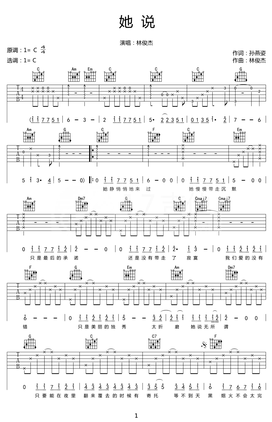 林俊杰她说吉他谱,C调指法。一直都很喜欢林俊杰的这首《她说》,歌曲由林俊杰作曲,孙燕姿作词的歌曲,第一次听就完全陷入了。旋律干净到一尘不染,燕姿写的歌词也触动人心。...