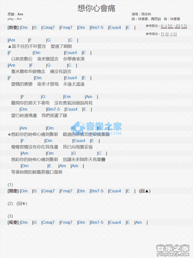 Am调版雨宗林《想你心会痛》吉他和弦弹唱谱...