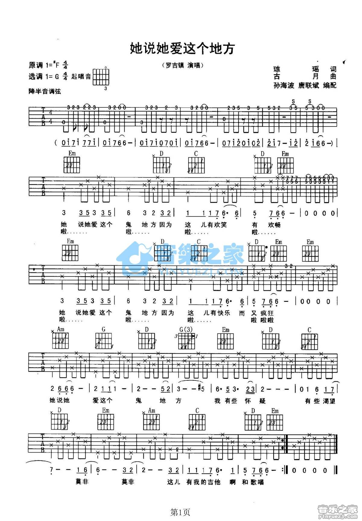 吉他罗吉镇《她说她爱这个地方》吉他谱_吉他弹唱谱_YYZJ编配