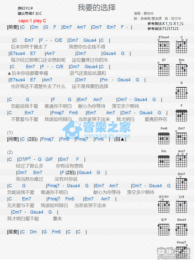 C调版蔡依林《我要的选择》吉他和弦弹唱谱...
