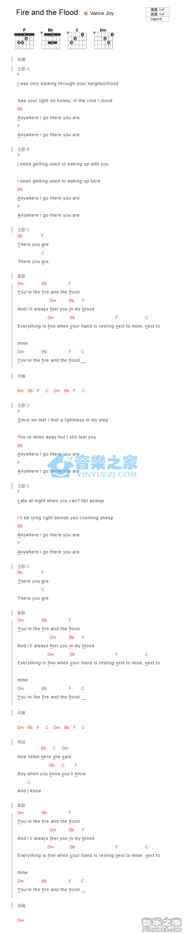 F调版VanceJoy《FireAndTheFlood》吉他和弦弹唱谱...