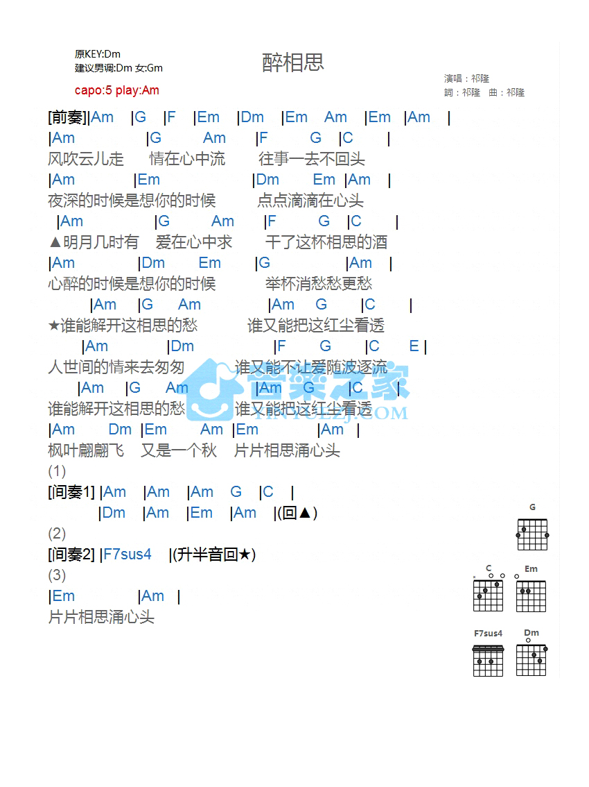 吉他祁隆《醉相思》吉他谱_吉他弹唱谱_YYZJ编配