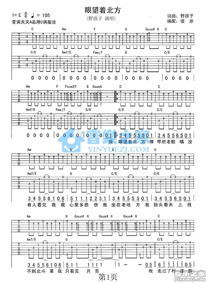 吉他张玮玮《眼望着北方》吉他谱_吉他弹唱谱_彼岸编配
