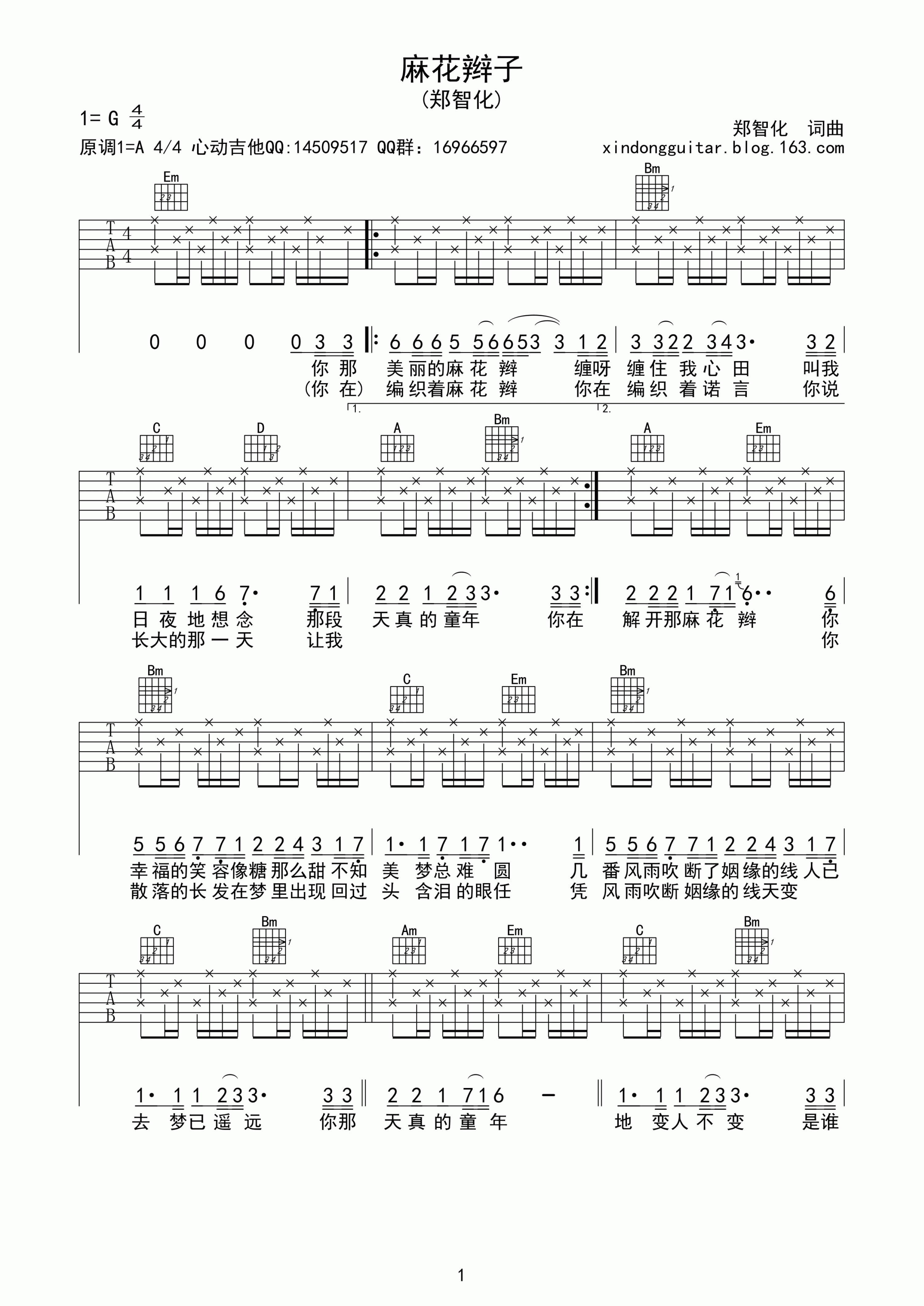 吉他郑智化《麻花辫子》吉他谱_吉他弹唱谱_心动吉他编配