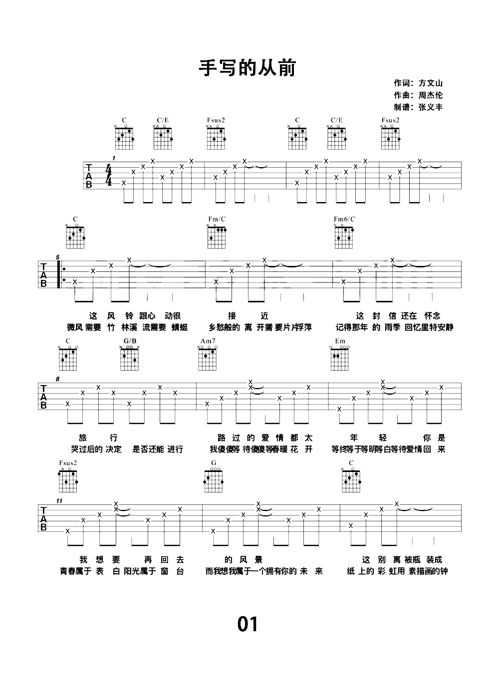 吉他周杰伦《手写的从前》吉他谱_吉他弹唱谱_弦木吉他--张义丰编配