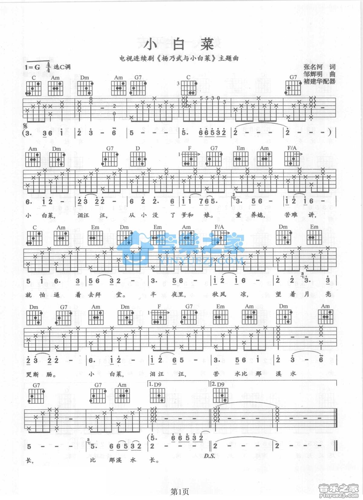 C调版河北民歌《小白菜》吉他弹唱六线谱...
