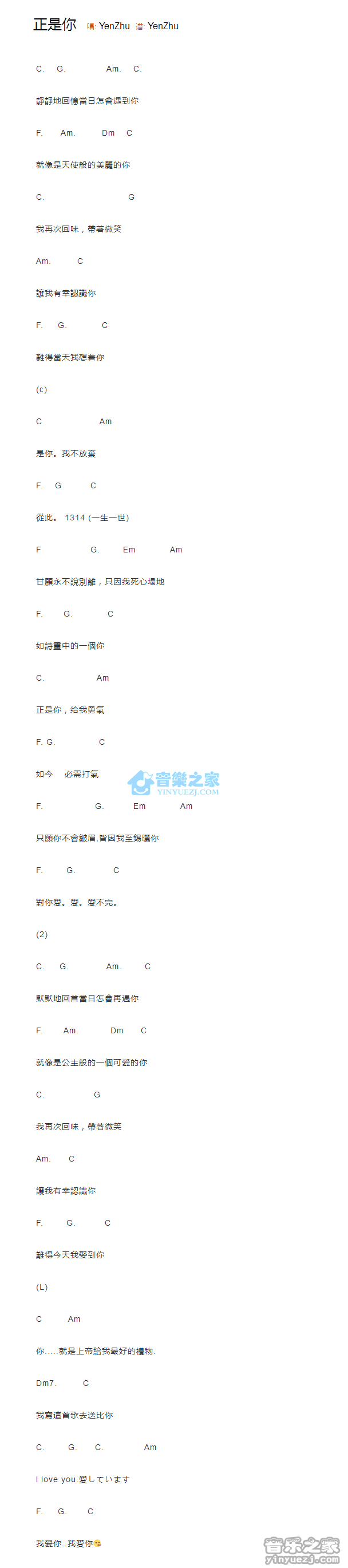 YenZhu《正是你》吉他和弦弹唱谱...