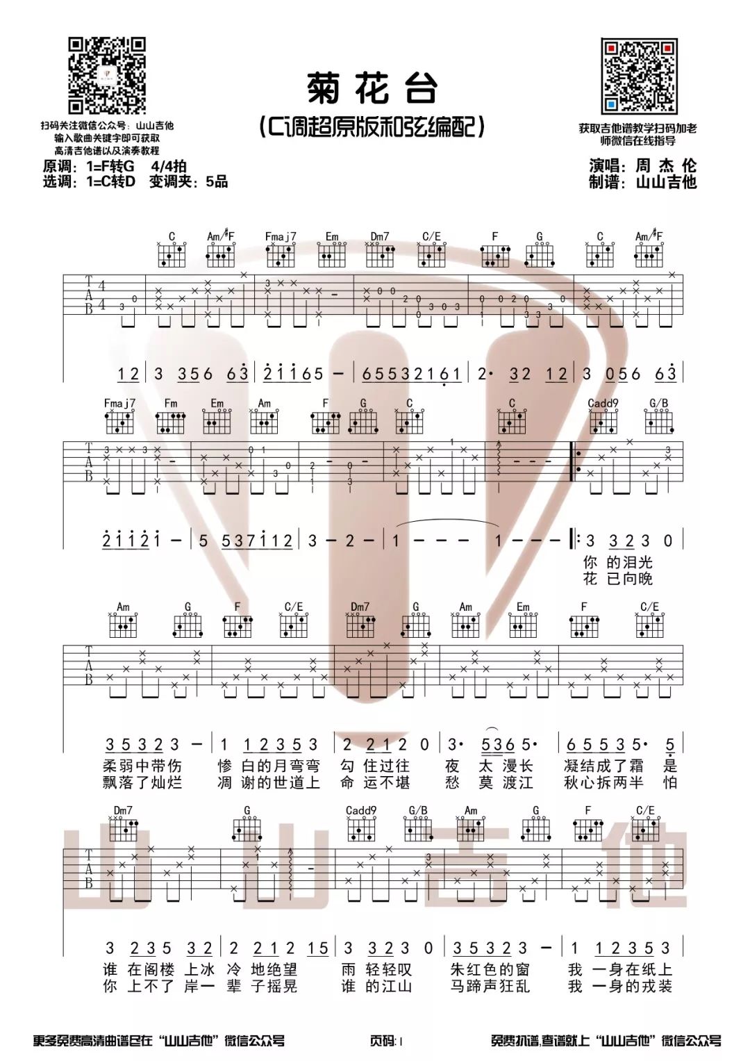 吉他周杰伦《菊花台》吉他谱 C调带前奏原版弹唱谱