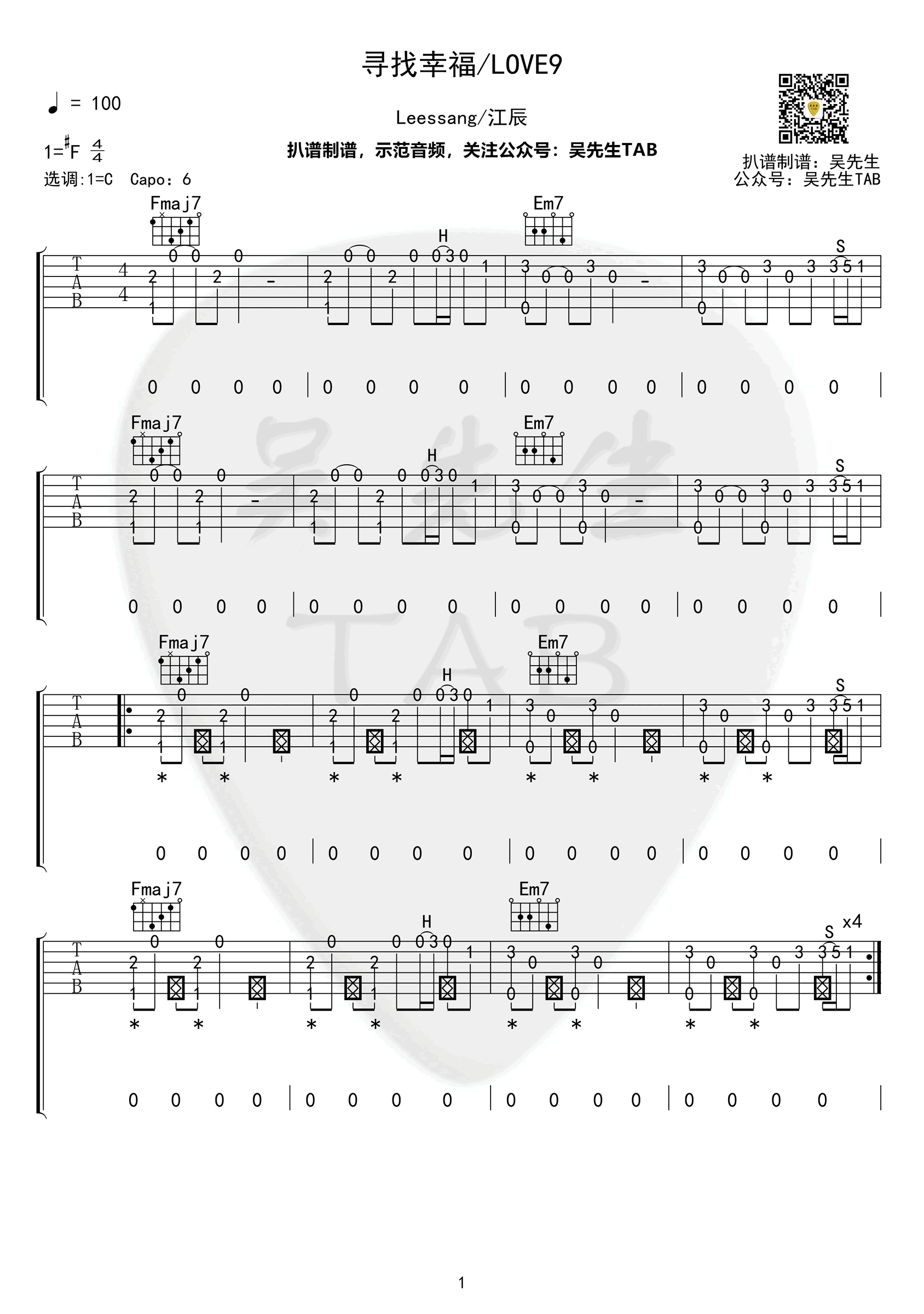 原调升F,选调C,Capo夹六品。leessang/江辰的一首演唱歌曲改编版,吴先生扒谱制谱...