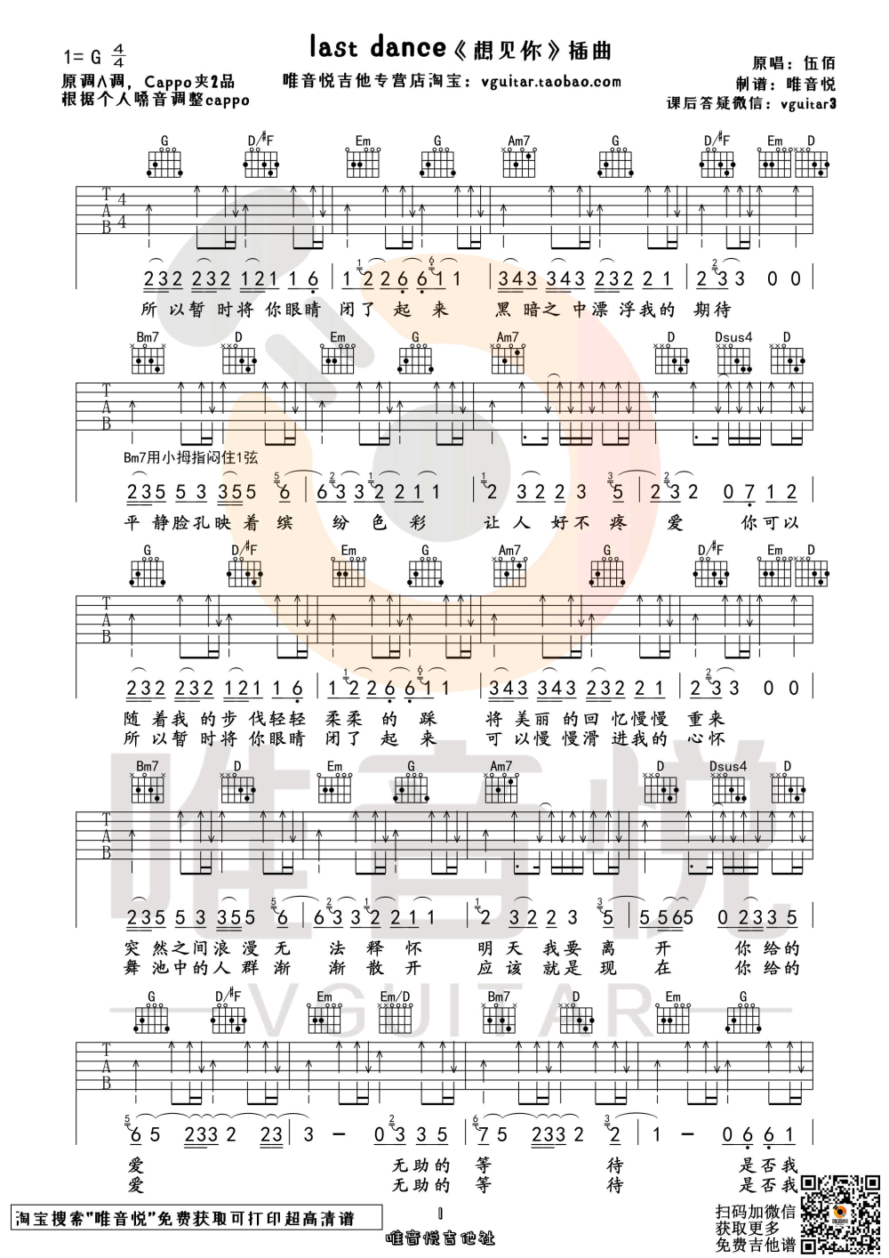 伍佰演唱,台湾电视剧《想见你》插曲,lastdance原版简单吉他谱,原调A,选用G调指法,变调夹夹二品。琴友们可以根据个人嗓音调整CAPPO。唯音悦编配出品...