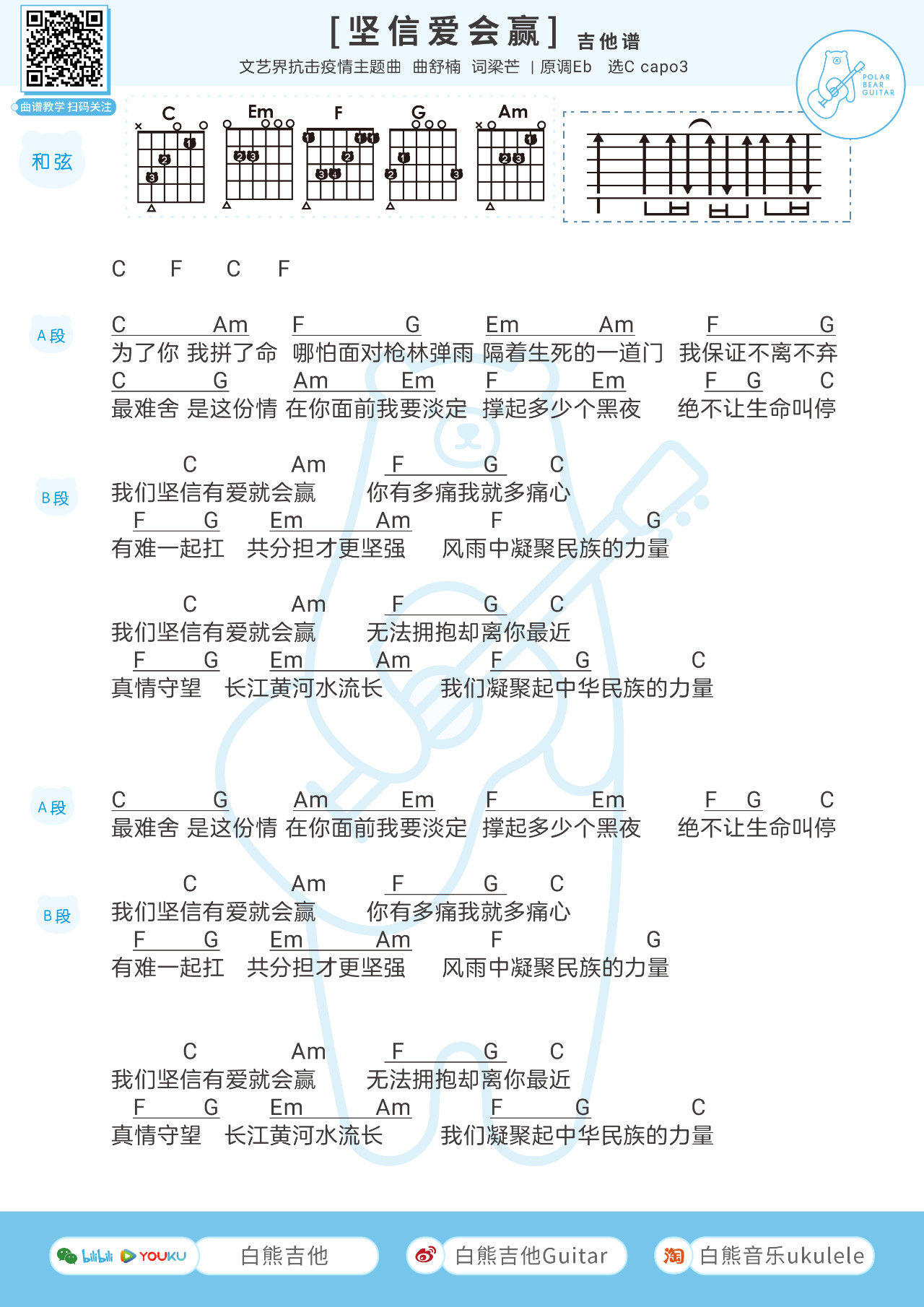 吉他群星《坚信爱会赢》吉他谱 C调和弦谱附节奏