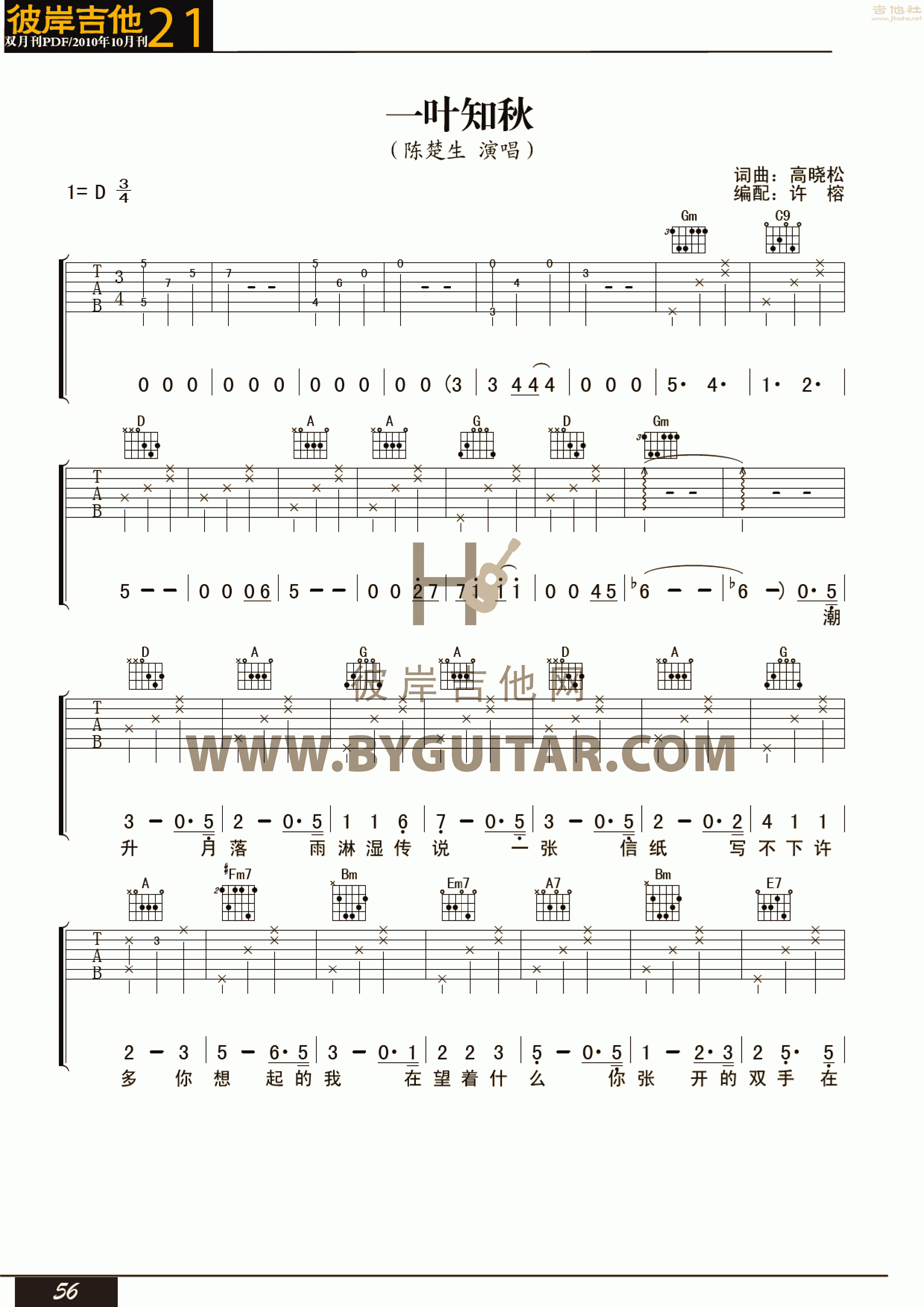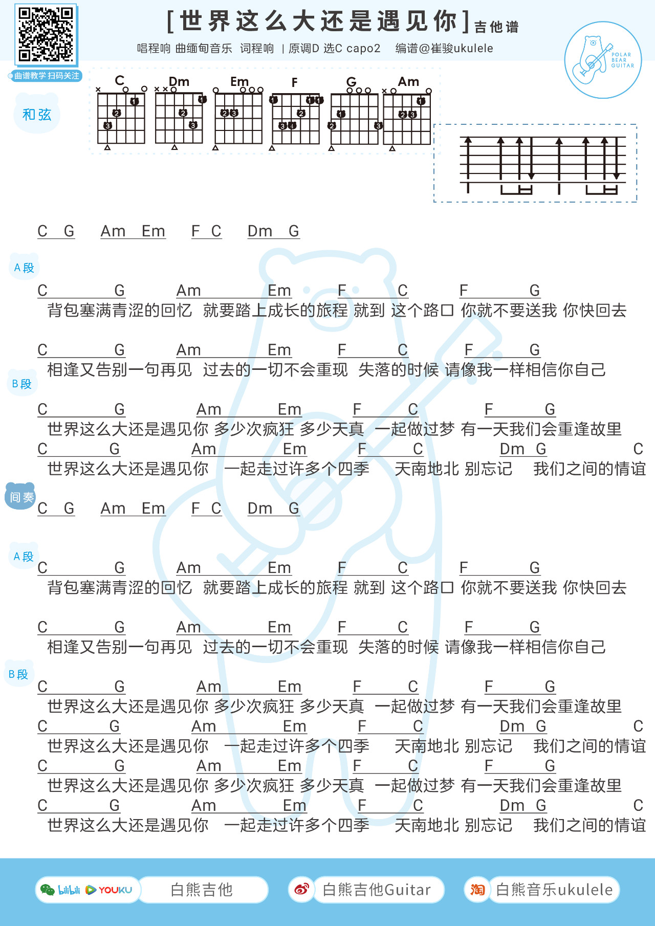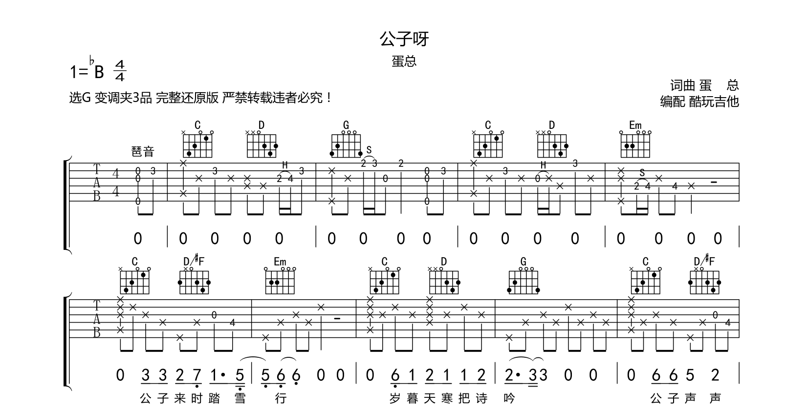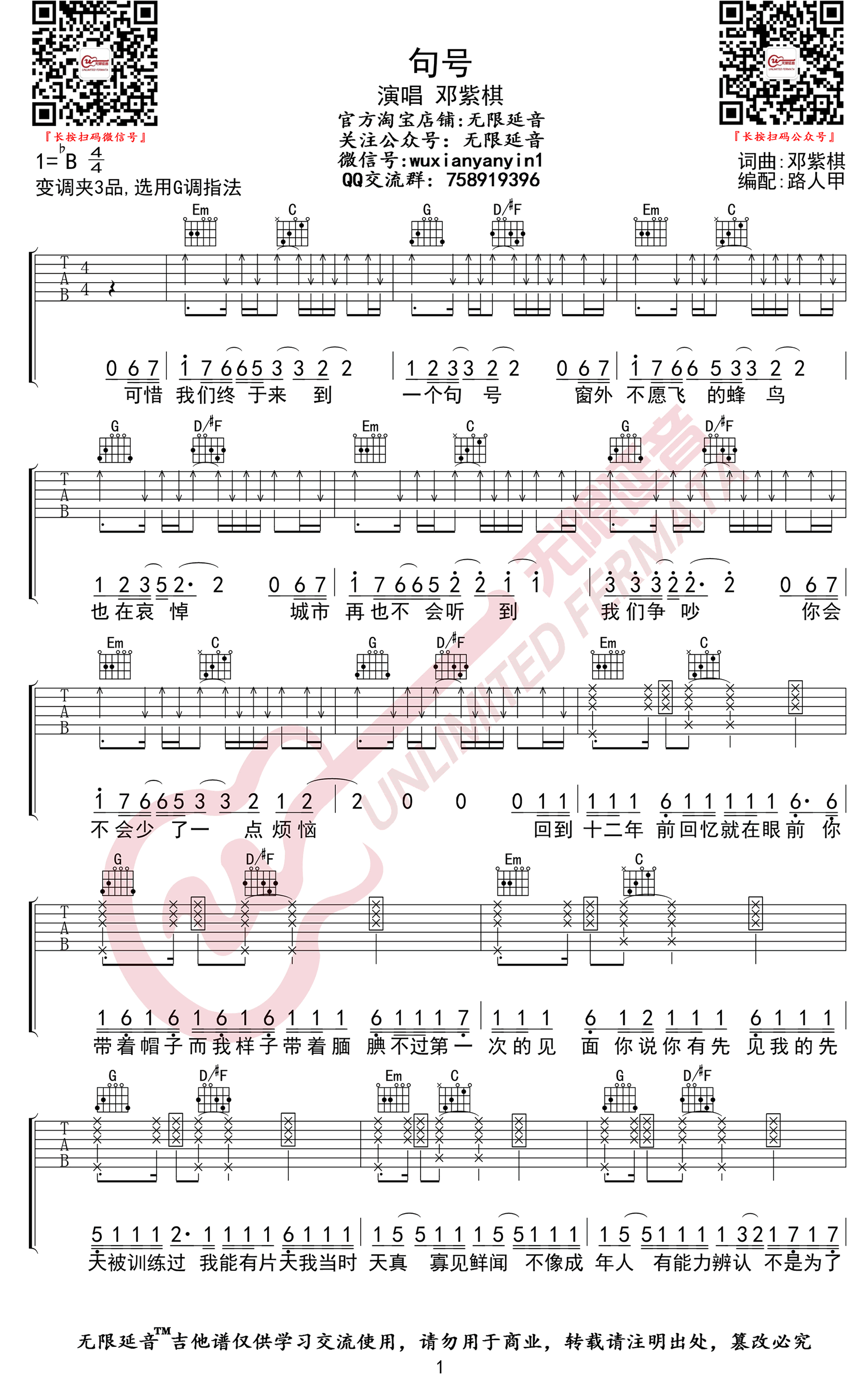 降B调,选用G调指法,变调夹夹第三品。句号六线谱,共三张弹唱图片谱。无限延音编配分享...