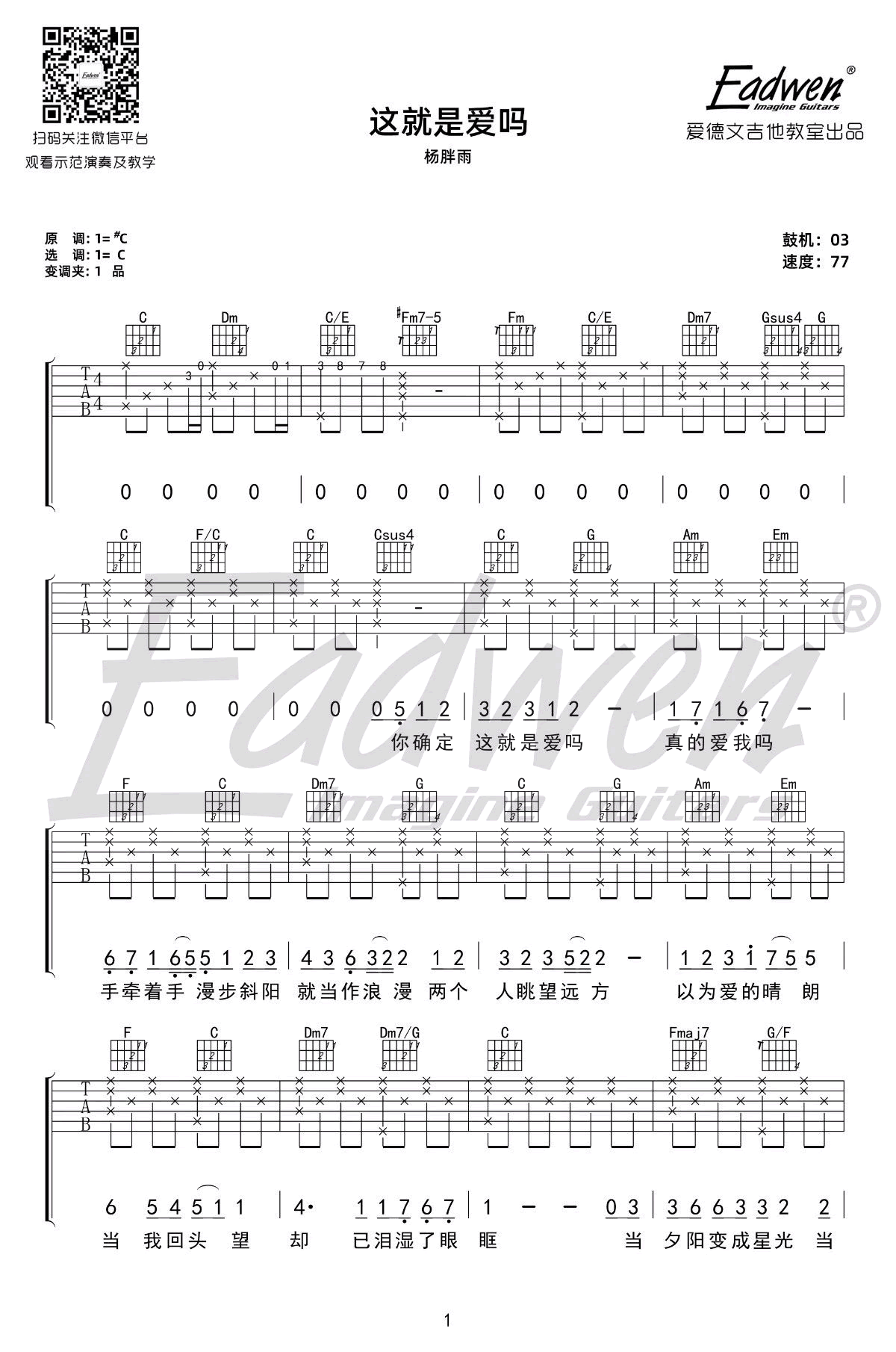 容祖儿原唱的一首经典情歌,这就是爱吗六线谱,C调指法编配,变调夹夹一品,两张弹唱图片谱,爱德文吉他编配出品...
