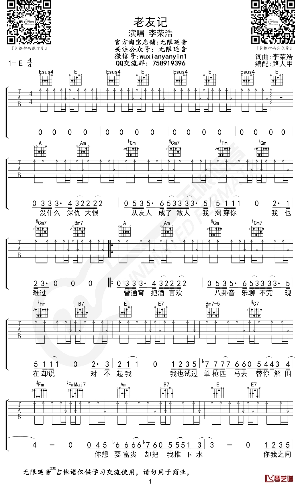 吉他老友记吉他谱 E调弹唱谱 李荣浩 无限延音编配