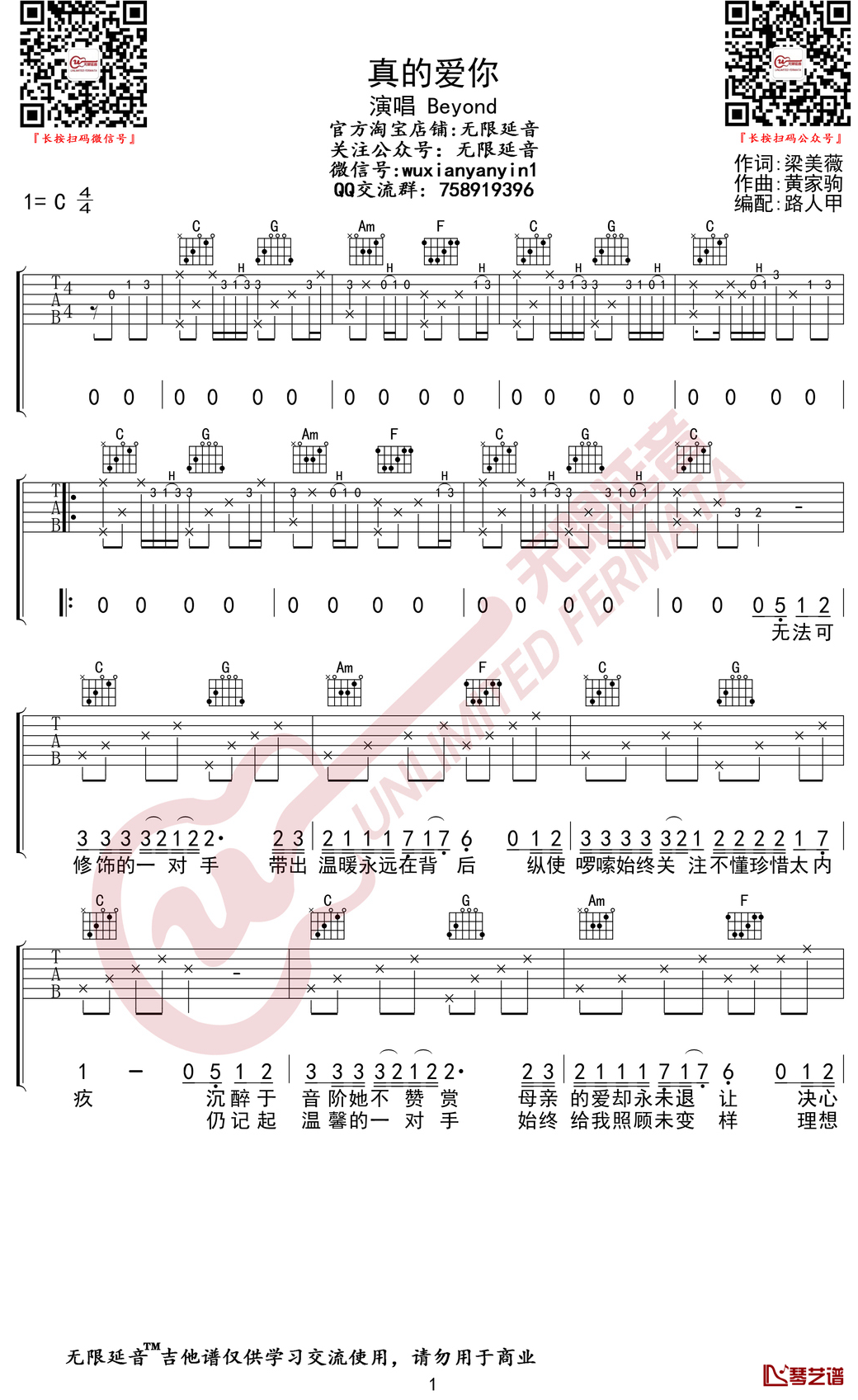 吉他真的爱你吉他谱 C调弹唱谱 Beyond 无限延音编配