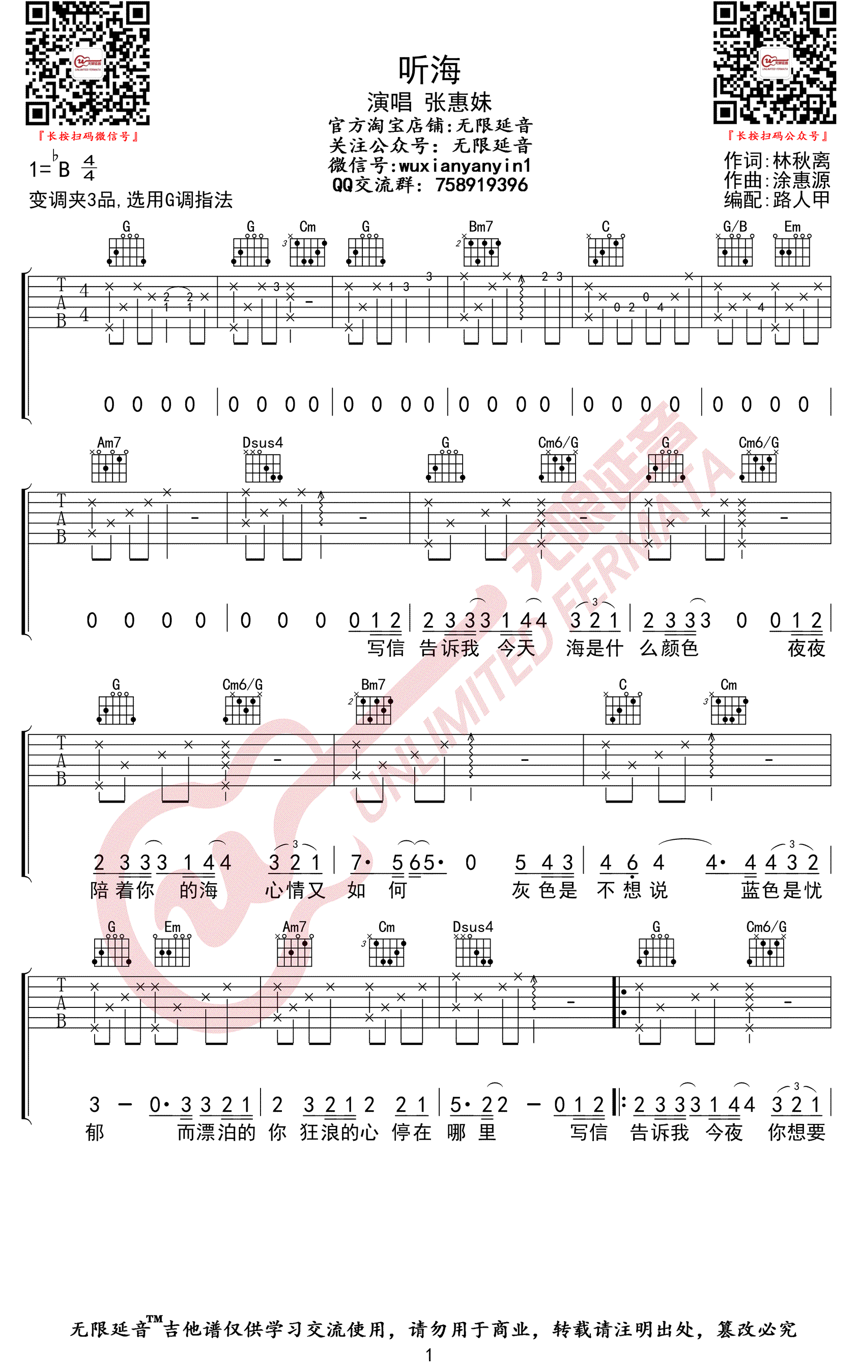 听海六线谱,原调降B,变调夹夹第三品,选用G调指法,三张高清弹唱图片谱,无限延音编配出品...