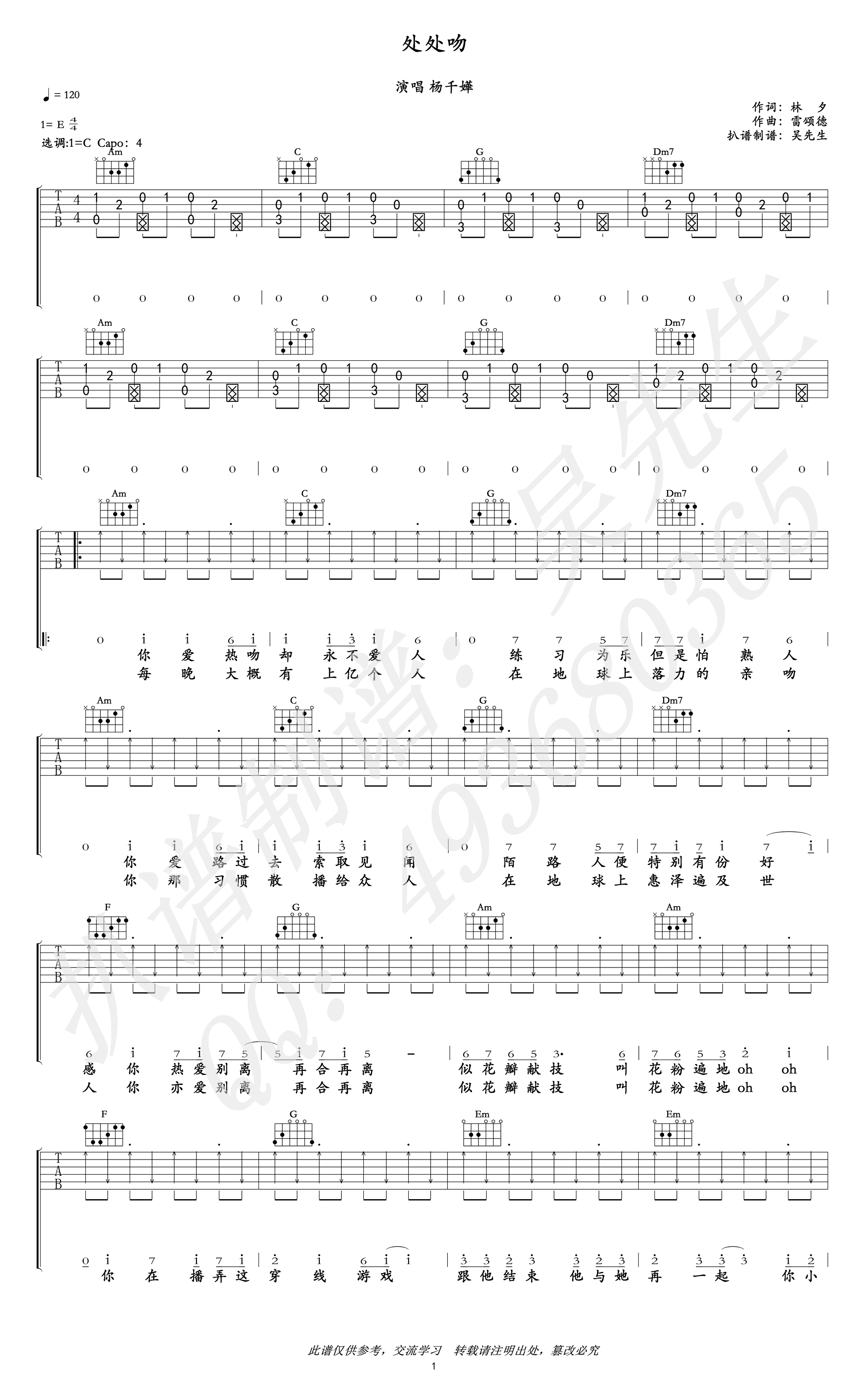 吉他处处吻吉他谱_杨千嬅_C调六线谱