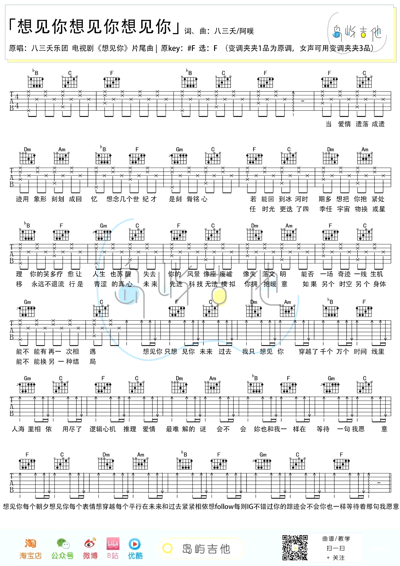 原调升F,选用F调指法,变调夹夹一品,女生建议用变调夹夹第三品。感谢岛屿吉他编配...