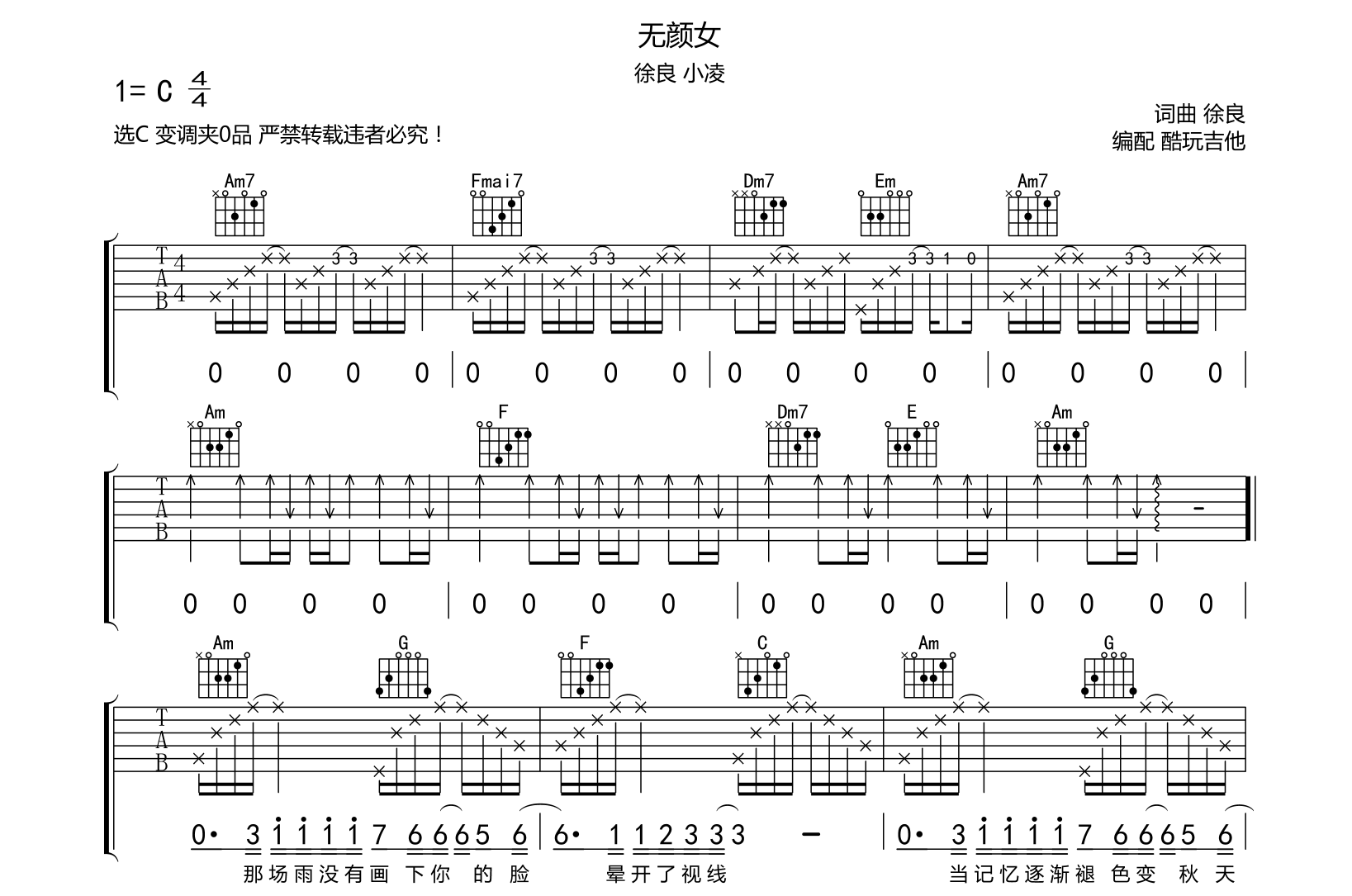吉他无颜女吉他谱-徐良、小凌琴友定制