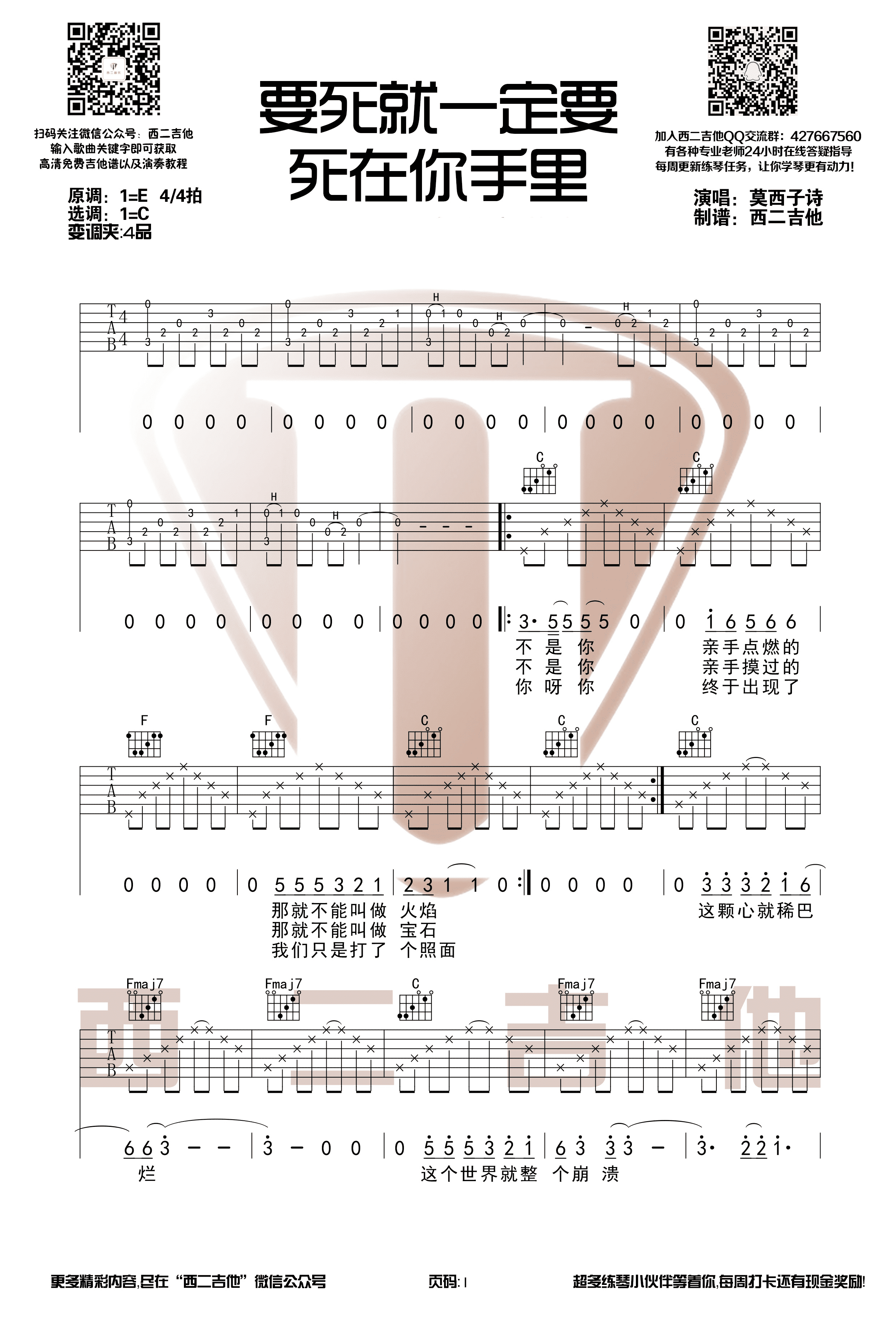 吉他莫西子诗 - 要死就一定要死在你手里 吉他谱