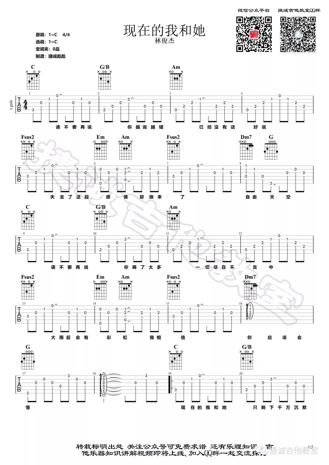 吉他林俊杰《现在的我和她》吉他谱 C调弹唱谱