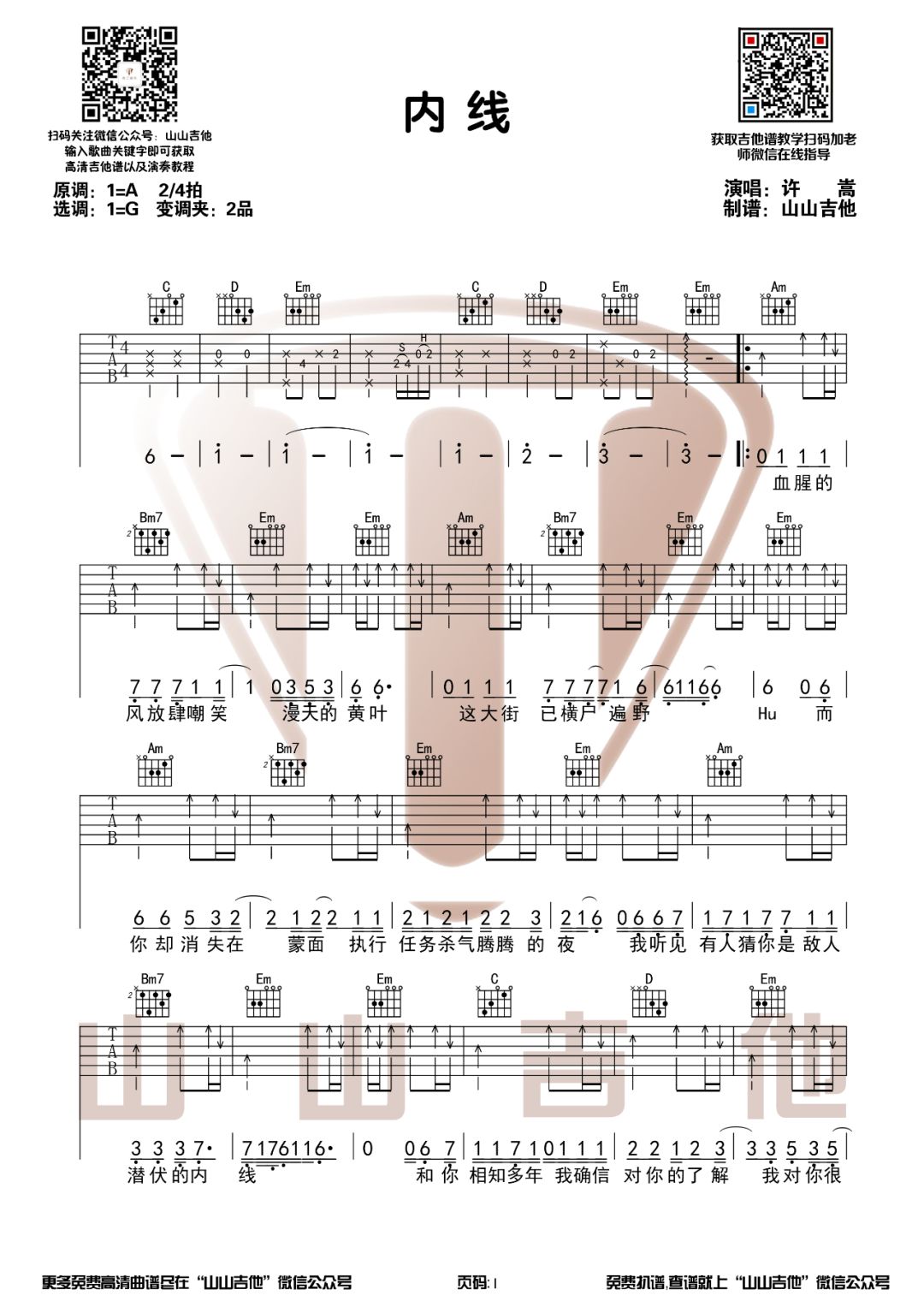 吉他许嵩《内线》吉他谱 G调弹唱谱