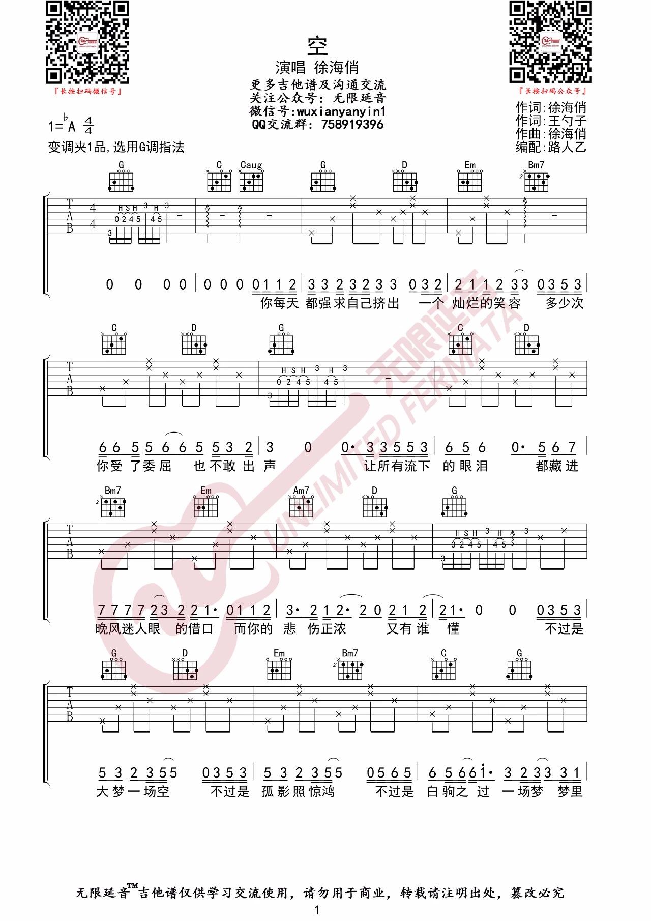吉他徐海俏《空》吉他谱 G调弹唱谱