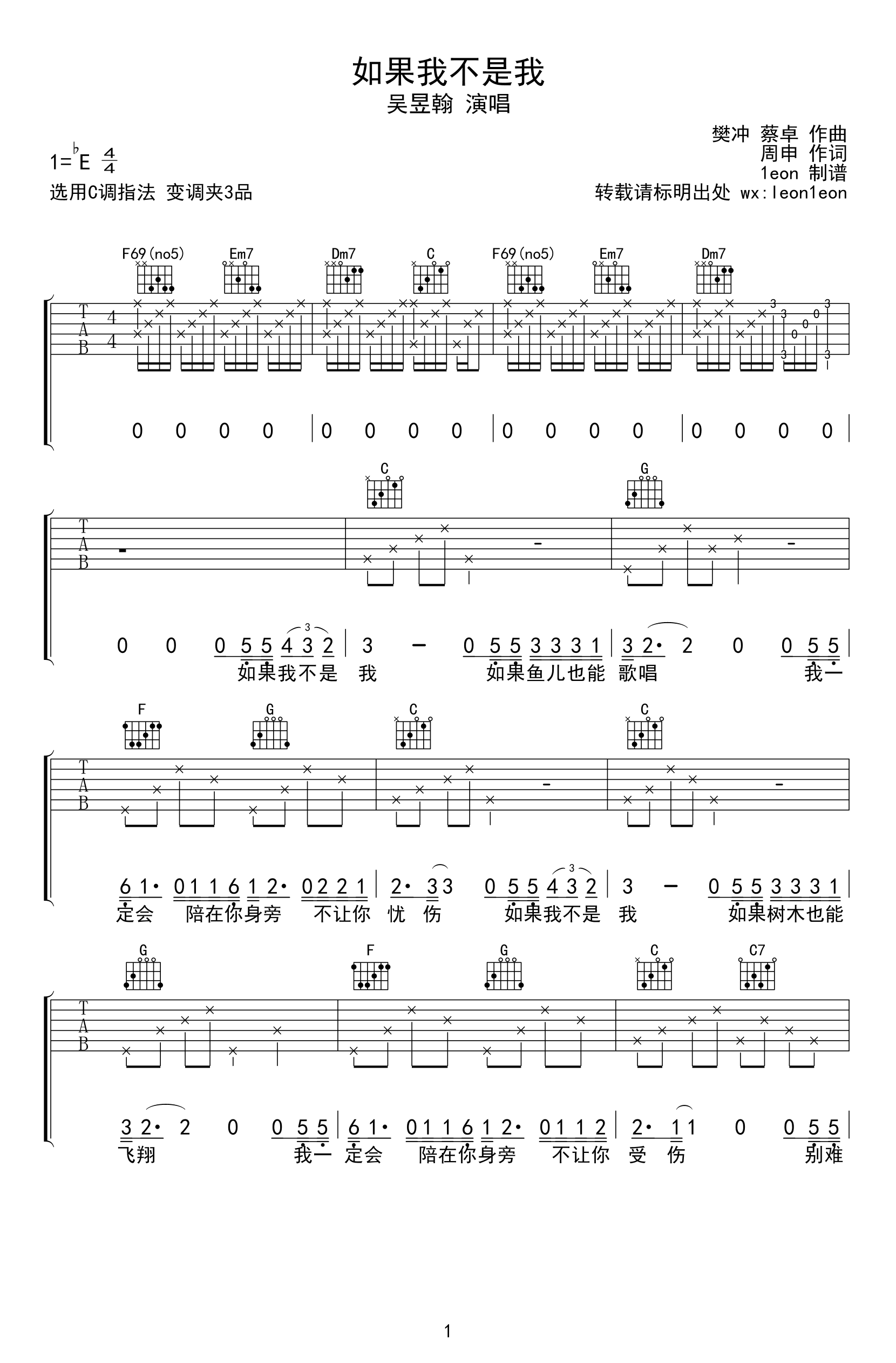 开心麻花贺岁电影《半个喜剧》主题曲,吴昱翰男生版。《如果我不是我》六线谱,原调降E,选用C调指法,变调夹夹三品。1eon编配扒谱...