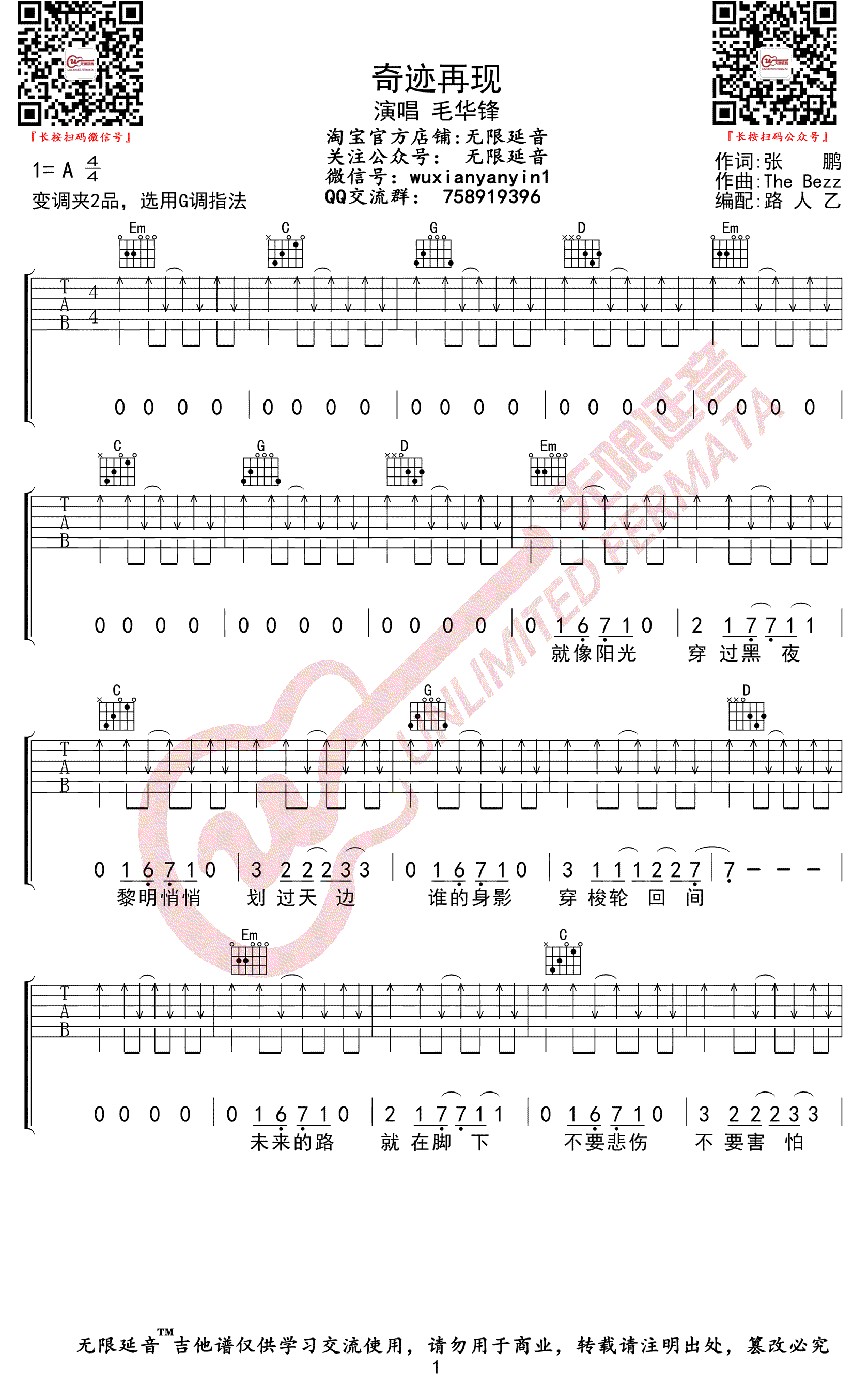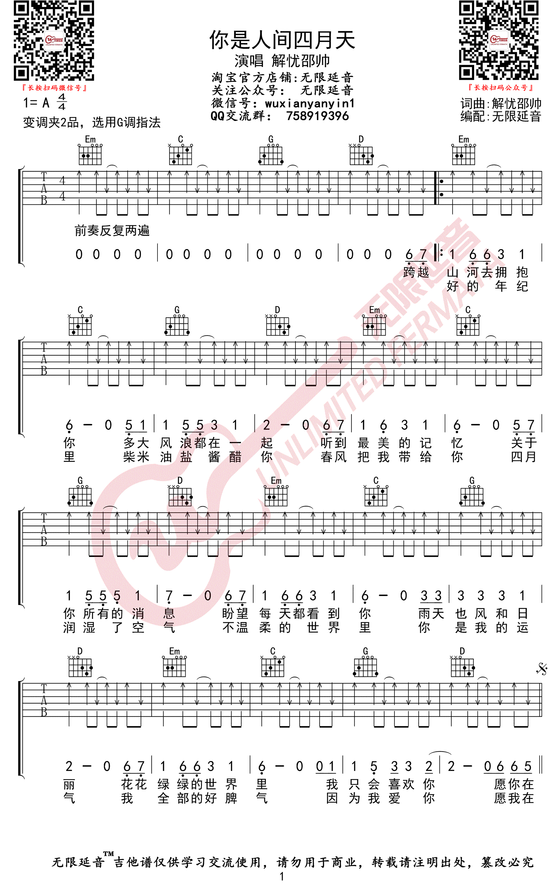 ,原调A调,变调夹夹第二品,选用G调指法。三张图片谱高清版,无限延音编配出品...